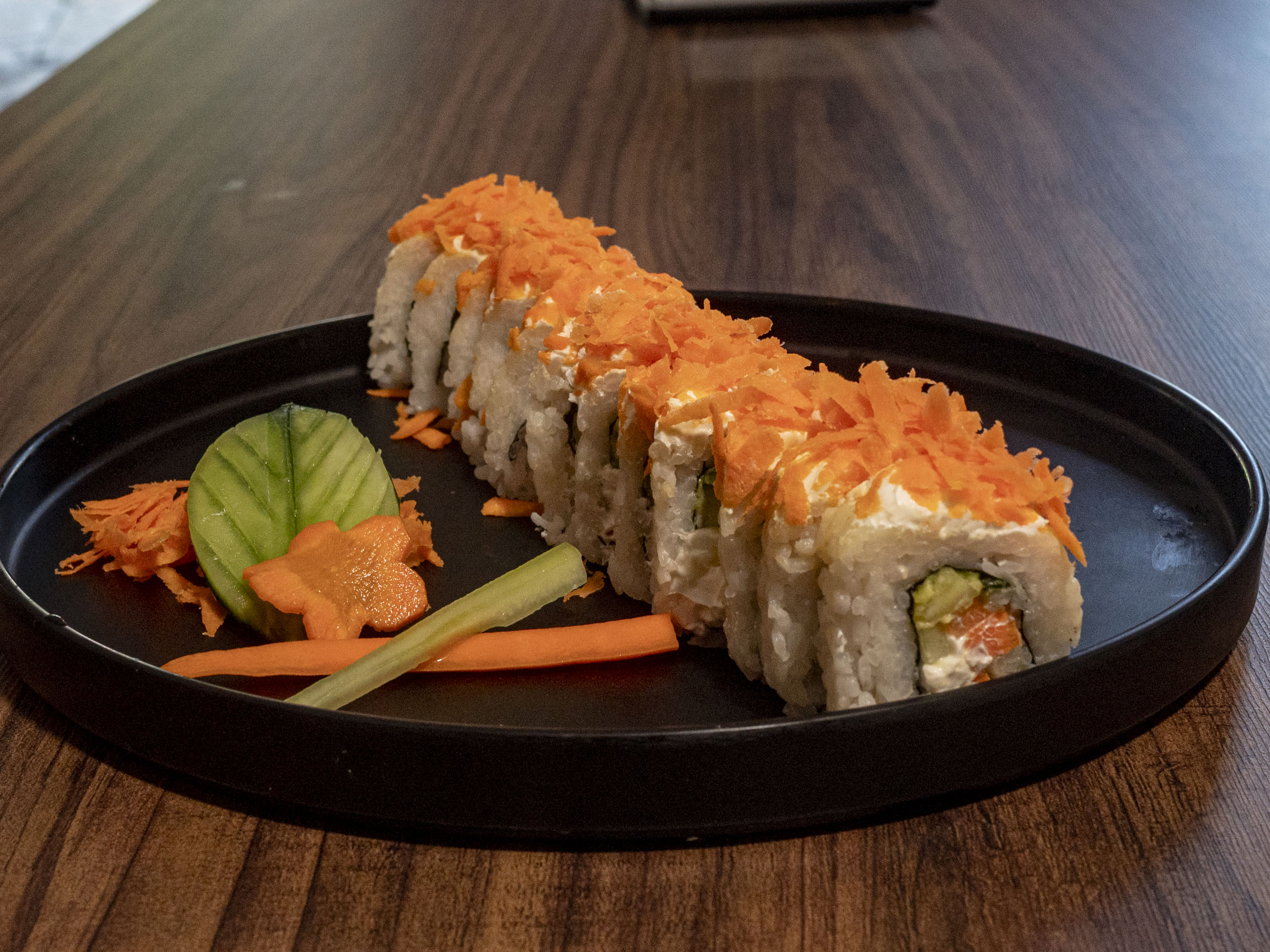 Rollo de arroz Philadelphia, pepino, aguacate y zanahoria por dentro. Por fuera Philadelphia y zanahoria. De 12 piezas.