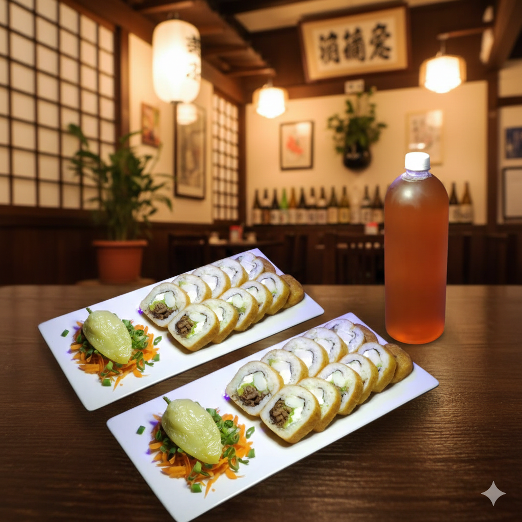 rollo con tampico, res, pollo y phila revuelto, pepino y aguacate por dentro por fuera gratinado en chipotle