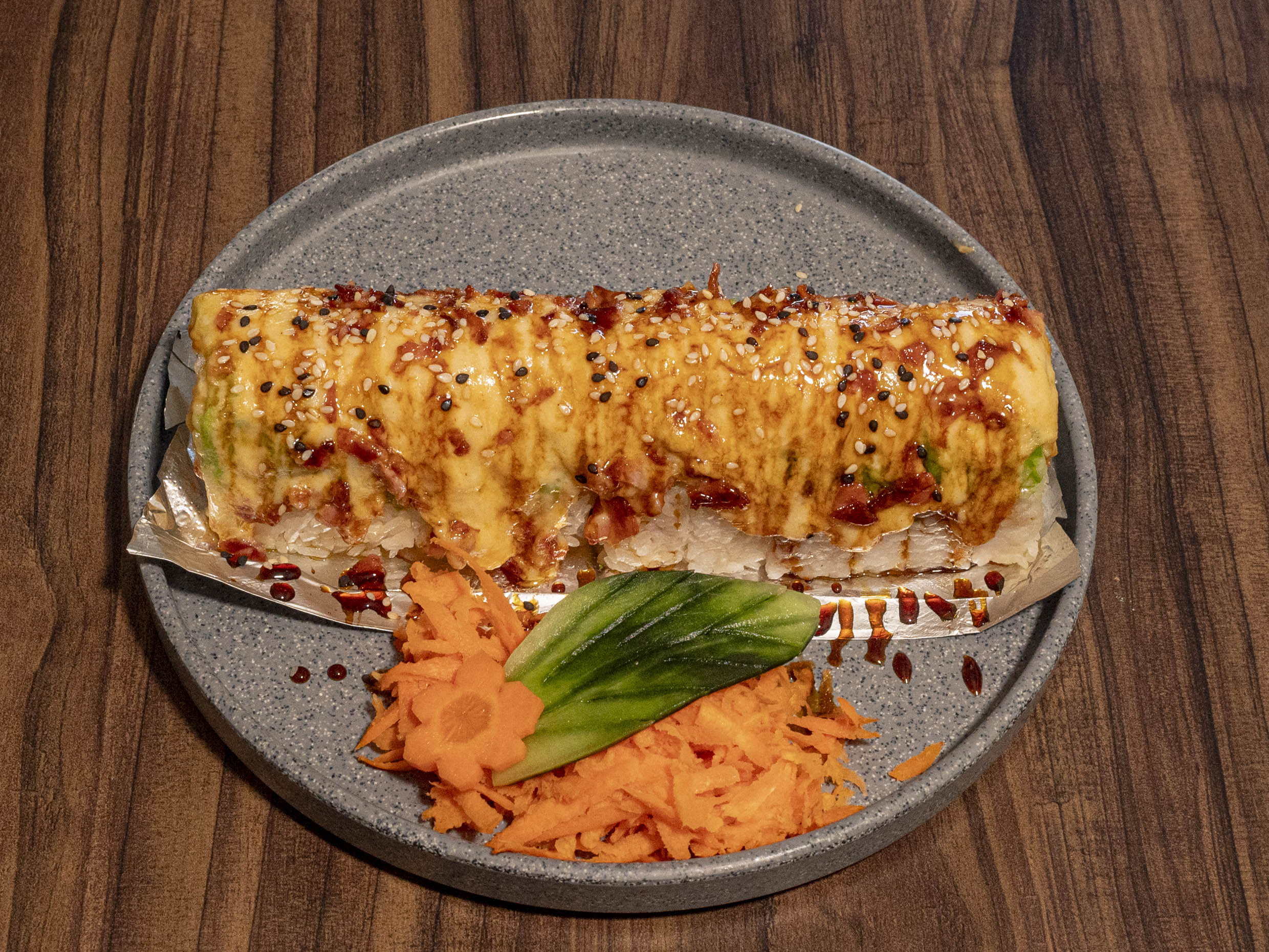 Philadelphia, pepino, aguacate, camarón y tocino por dentro. Por fuera queso gratinado spicy con toque de anguila.
