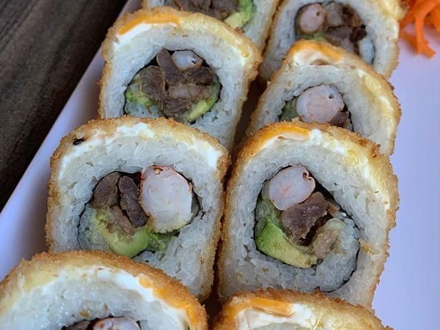 Rellena de tampico, camarón, res, pollo, Philadelphia, aguacate por encima con un toque de salsa de anguila y ajonjolí.