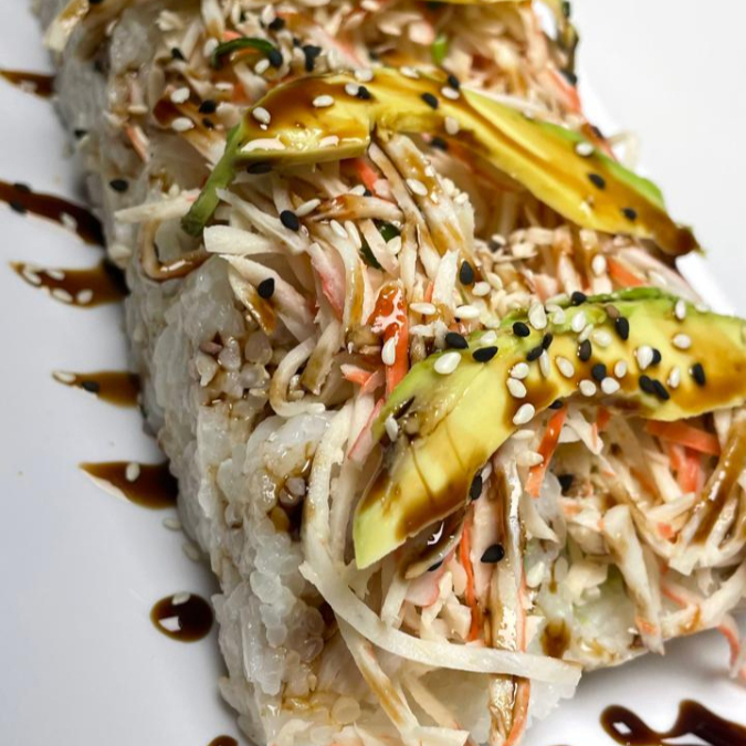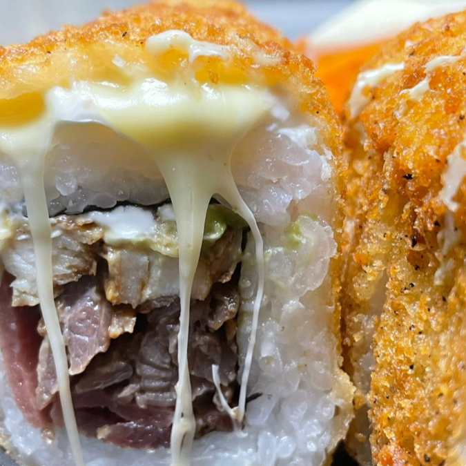 Rollo de Philadelphia, aguacate,pepino,res,pollo y tocino forrado de Philadelphia y queso Chester