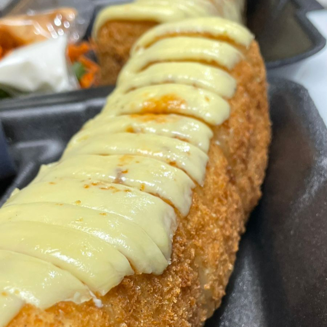 Rollo de Philadelphia, aguacate,pepino,pollo y tocino gratinado de queso Chester