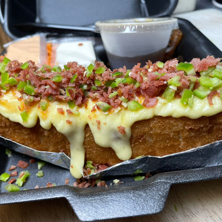 Rollo de Philadelphia, aguacate, pepino,res y pollo por fuera gratinado de queso Chester tocino y serrano