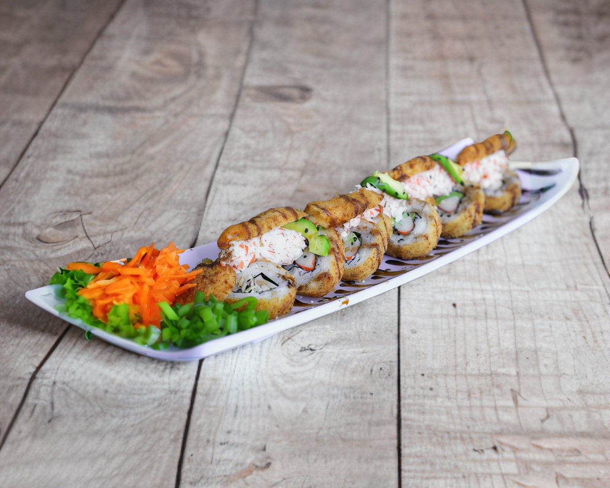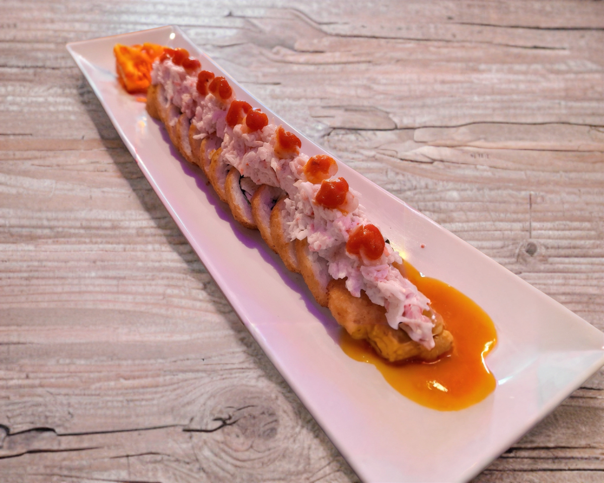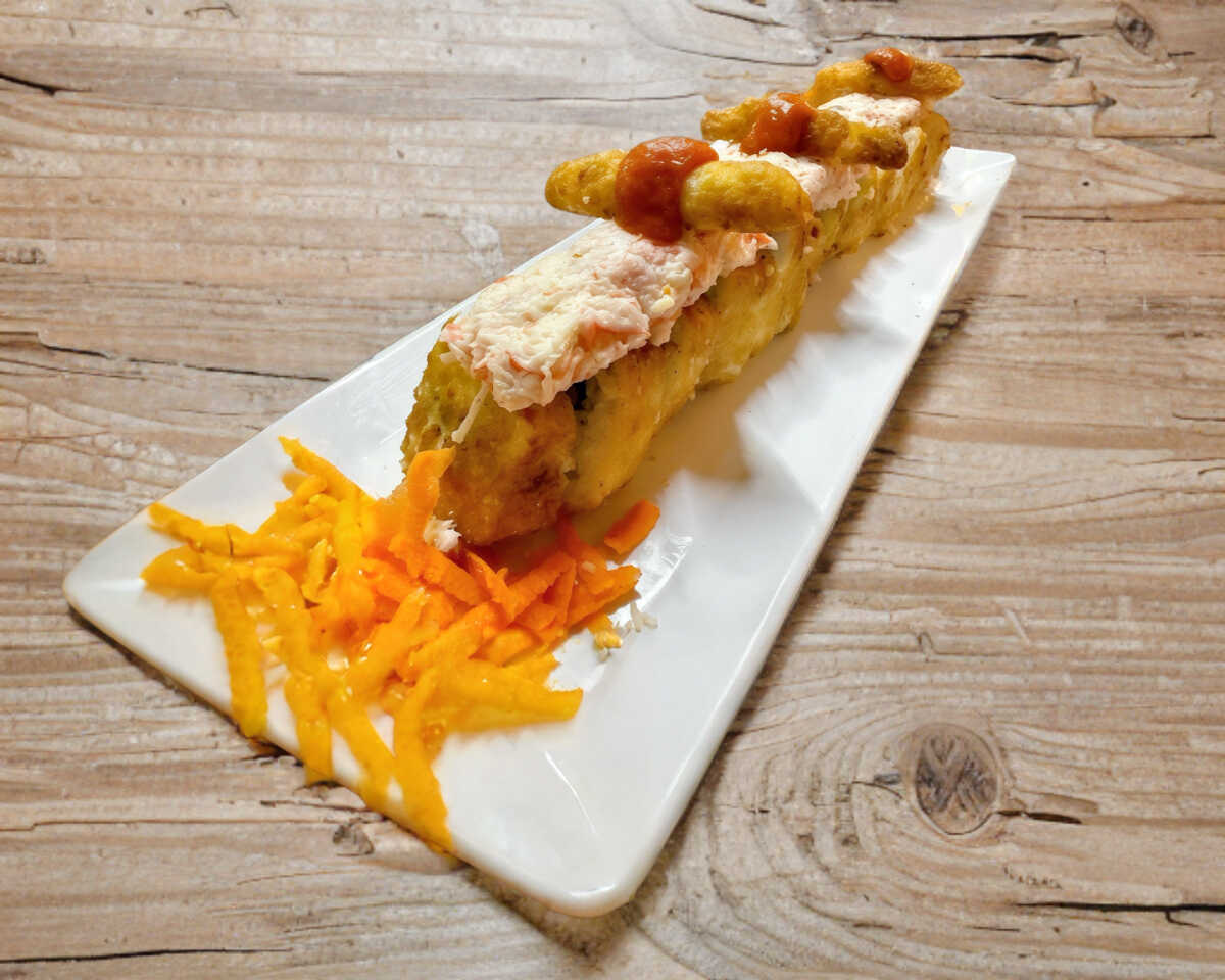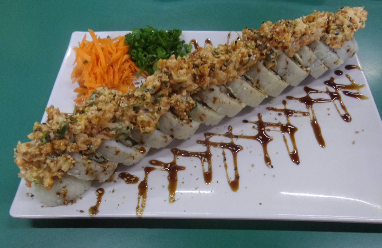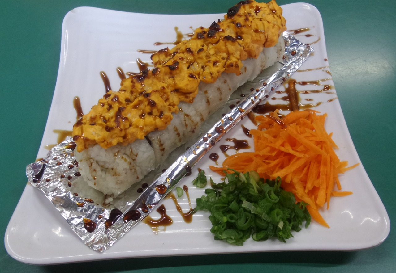 Exquisito sushi compuesto de pepino, philadelphia y res, gratinado por fuera, tampico coronado con camarones empanizados y rebanadas de aguacate y puntos de sriracha, bañado en salsa de anguila y ajonjolí.