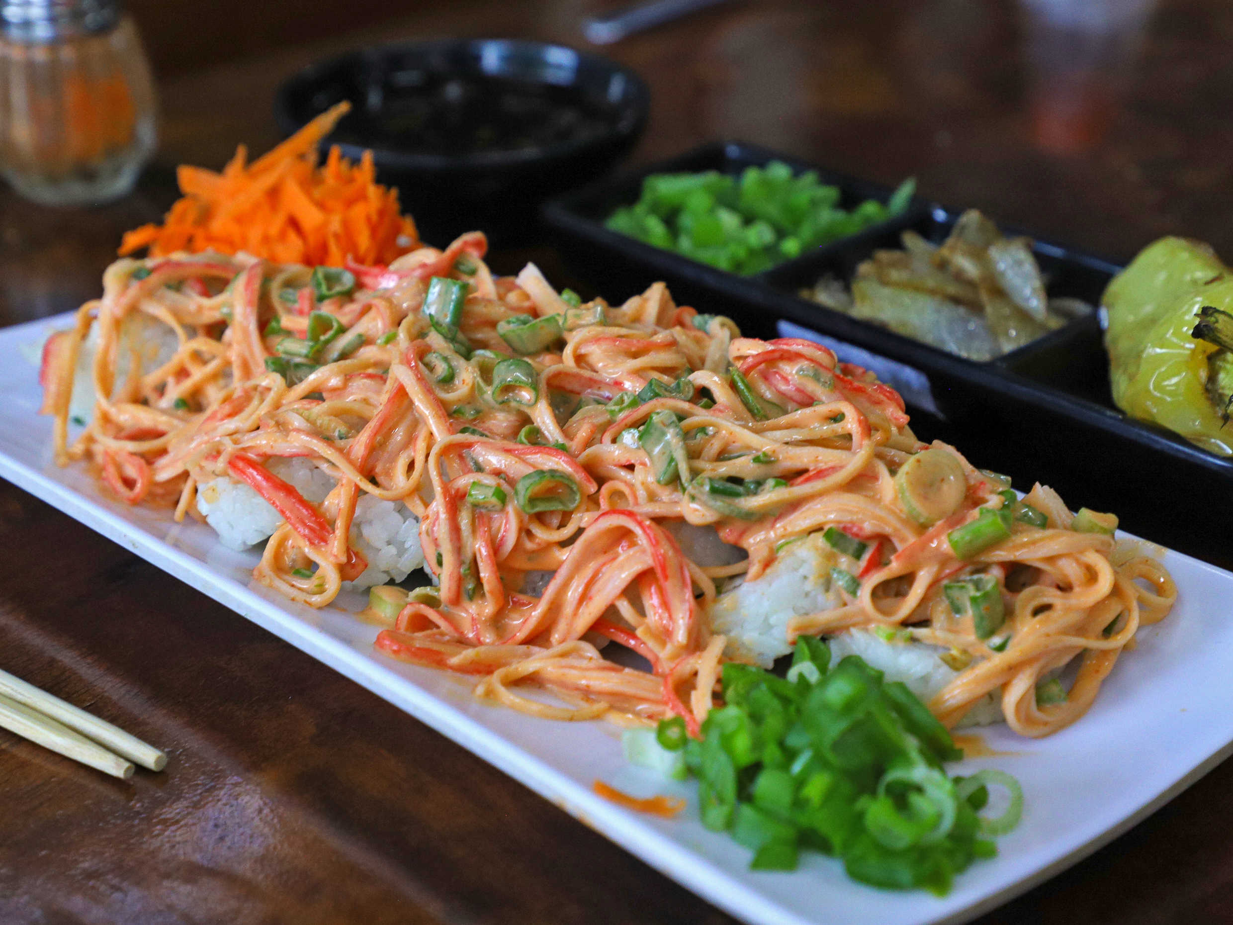 Suculento sushi de base completa, pepino, aguacate y philadelphia. Por fuera una pasta de camarón, res, chihuahua, cebolla frita, chile caribe, cebollín y sriracha.