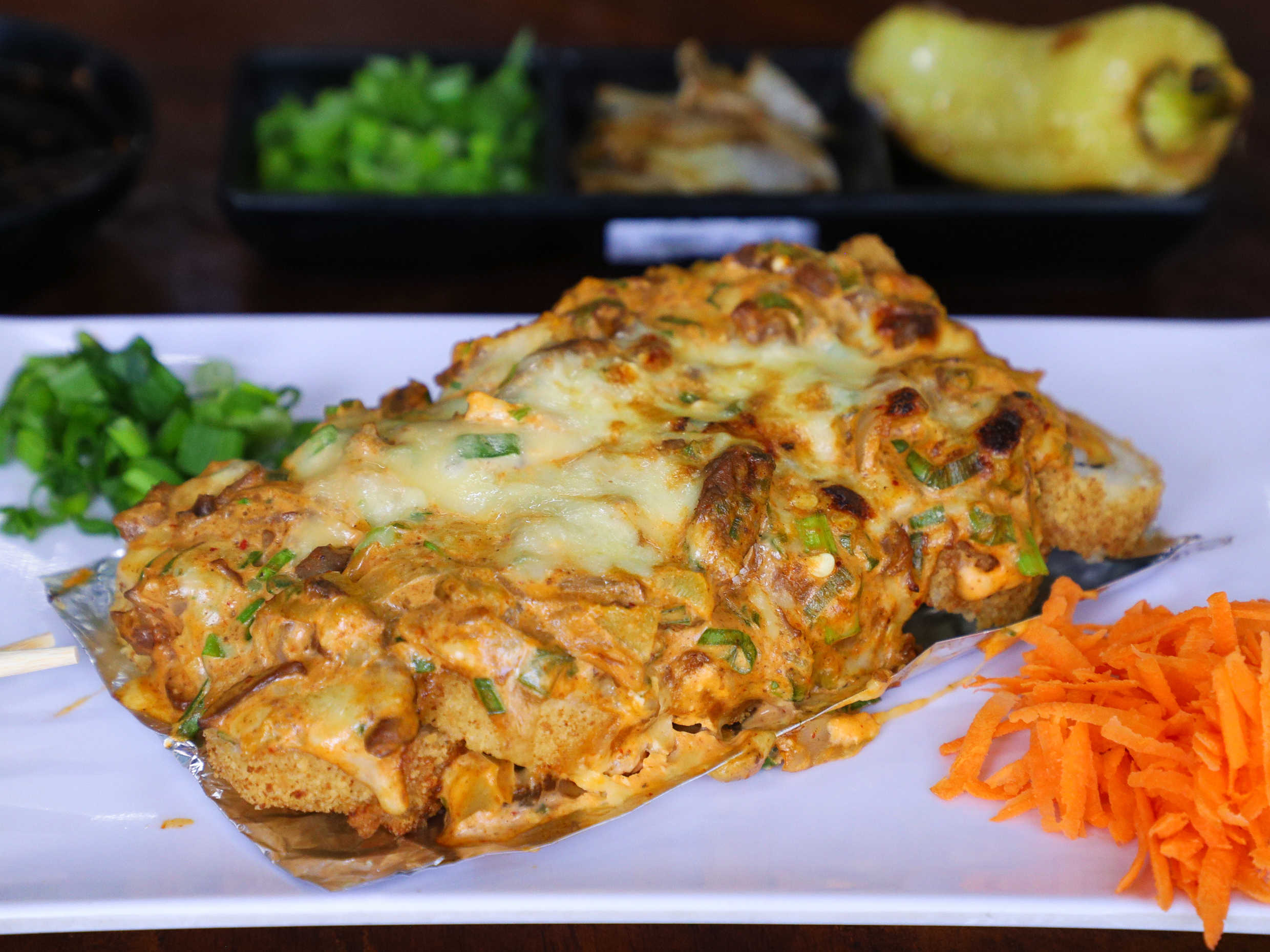 Por dentro: Filadelfia, aguacate, pepino, res, pollo. Por fuera: mitad pasta para hornear, mitad gratinada con serrano.