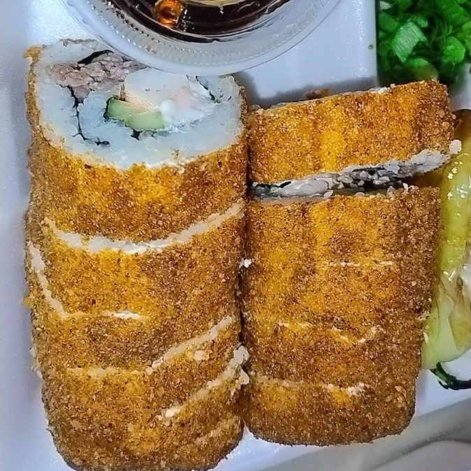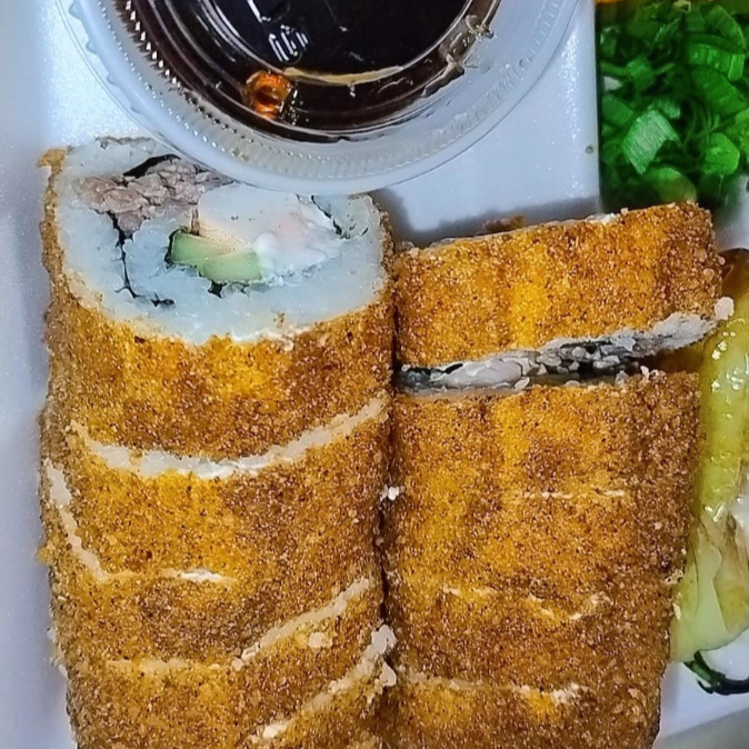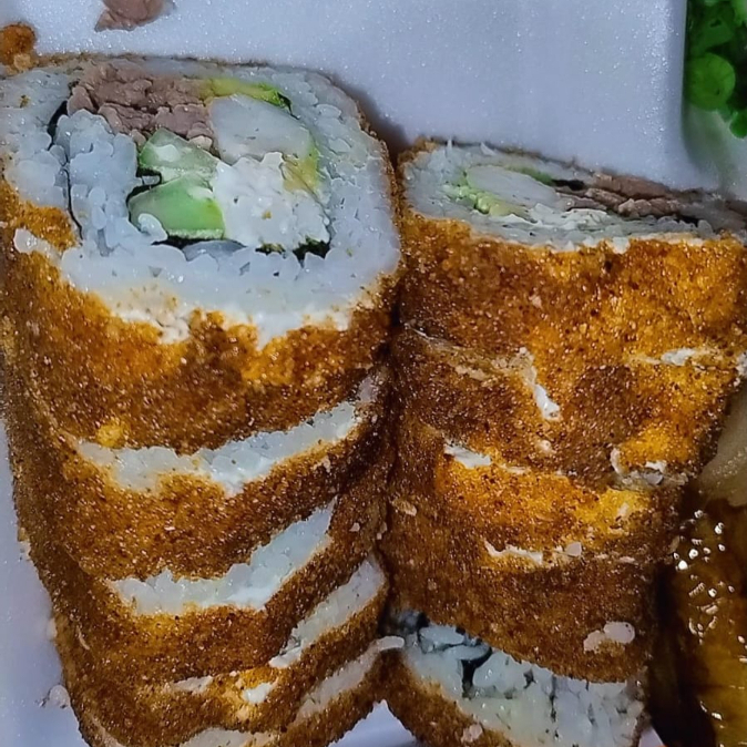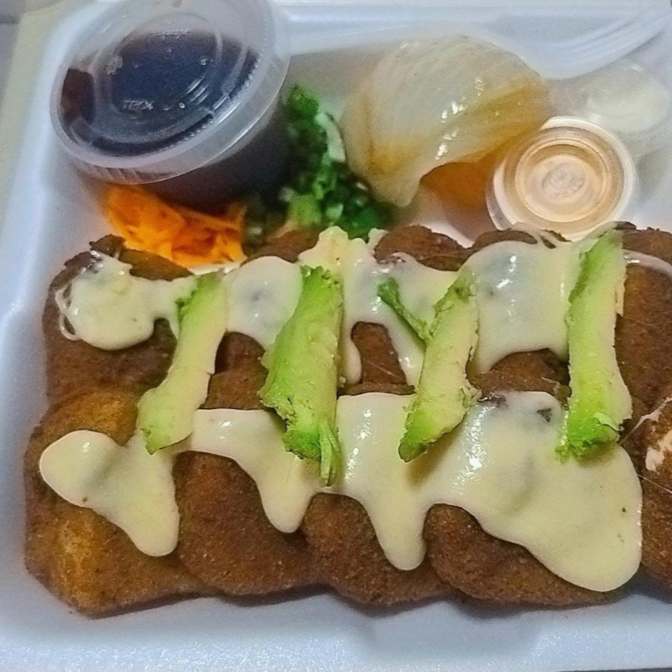 El Clásico Mar y Tierra pero con un sabor que te encantara, rollo empanizado por dentro phila, aguacate, pepino, camarón y res.