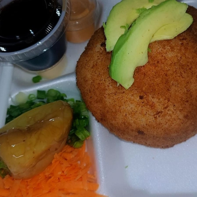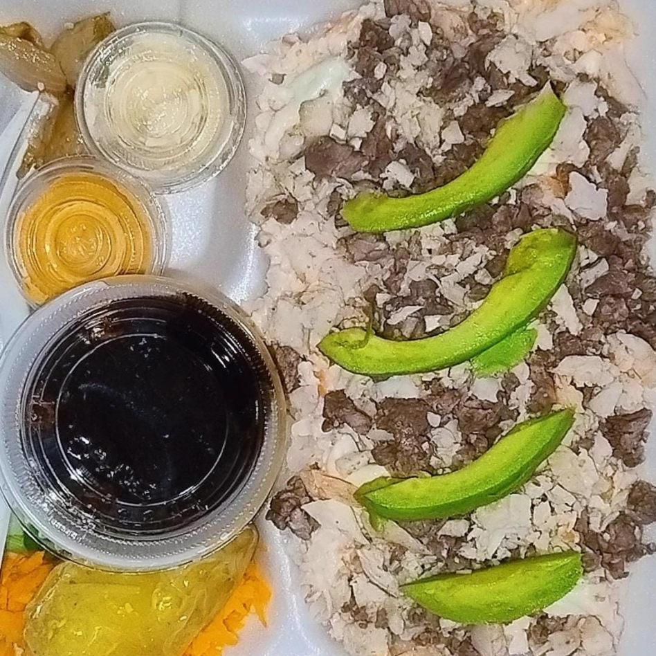 Delicioso platillo encamado de arroz, cubierto con Tampico, toque de philadelphia, con res, pollo y camarón, y aguacate por encima, riquisimo!