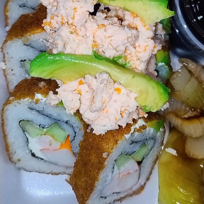 El sushi de la casa! Por dentro Phila, pepino, aguacate, surimi, camarón, pollo, queso chihuahua, y un toque de serrano, por fuera camarón y aguacate, coronado con Tampico.