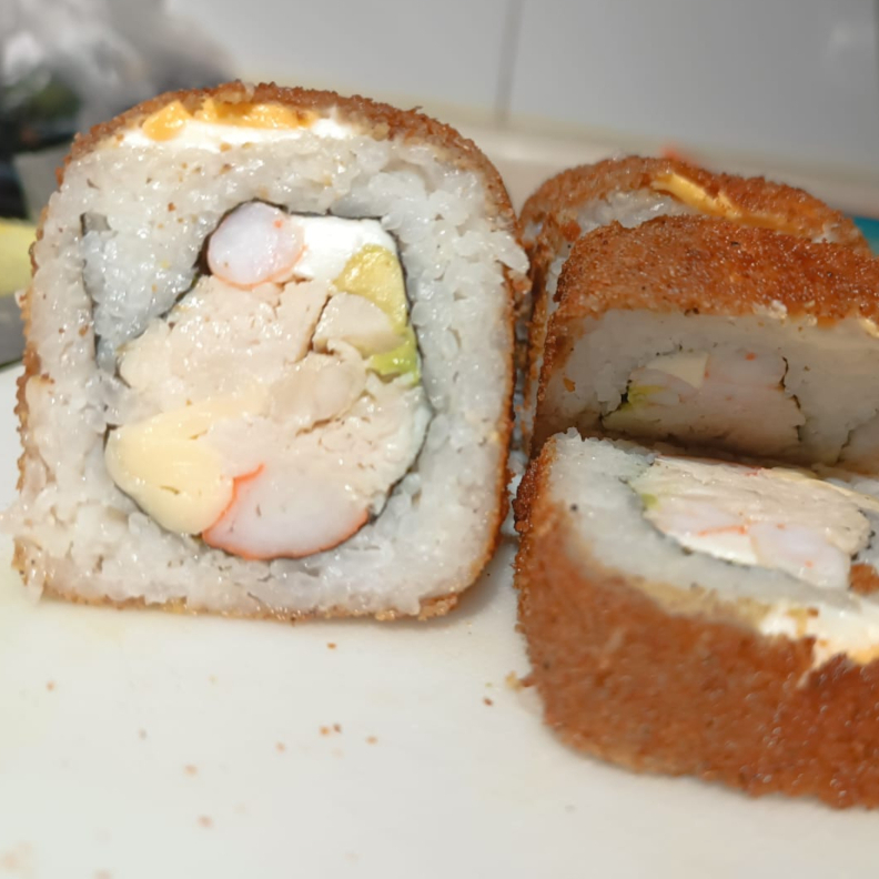 Un rollo picosito pero delicioso, Por dentro phila, aguacate, pepino, pollo y chiles caribes en rajas, por fuera surimi empanizado, una delicia picosita! atrévete a probarlo!