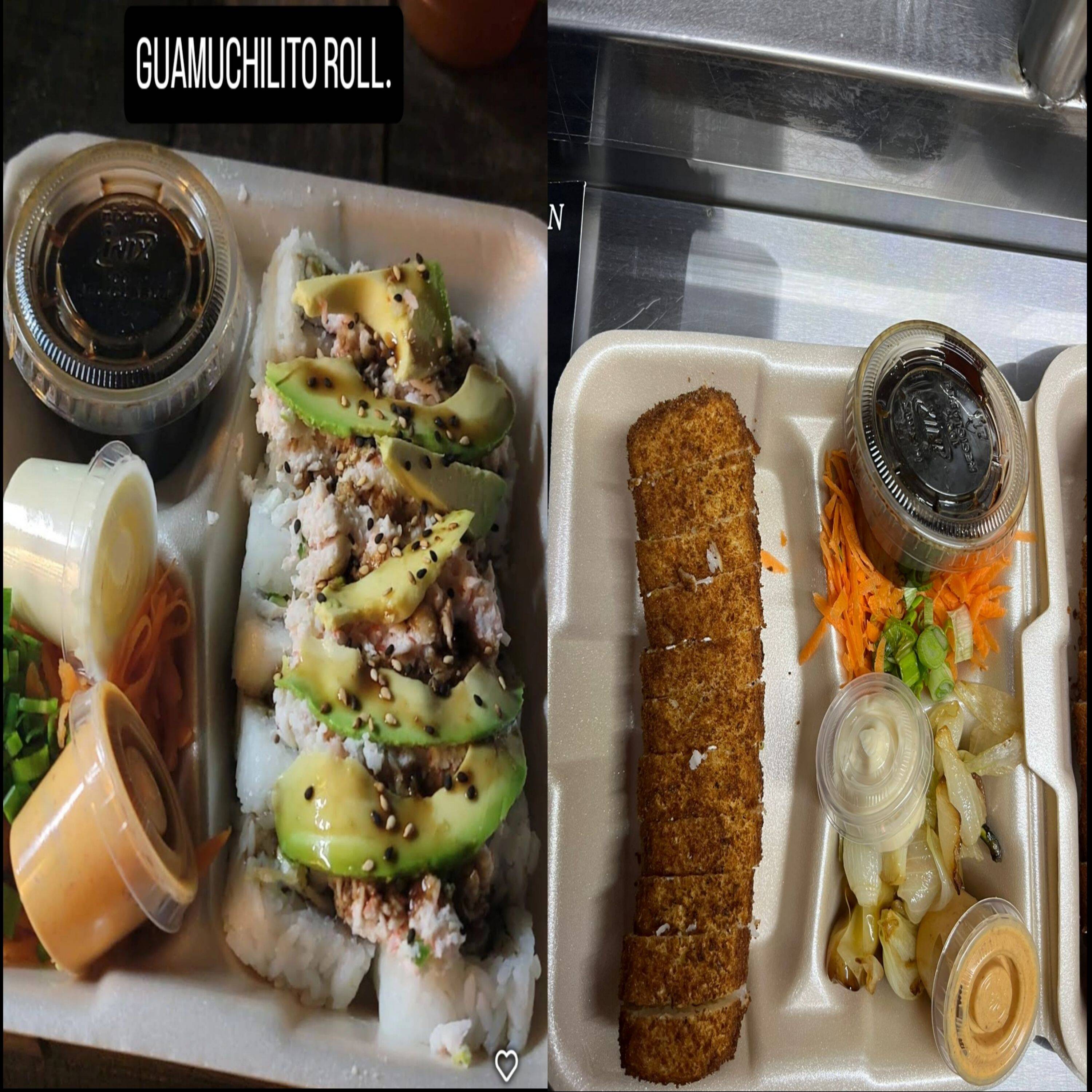 Por dentro: Philadelphia, pepino, aguacate, camarón empanizado. Por fuera: alga, spicy camarón, anguila, ajonjolí.