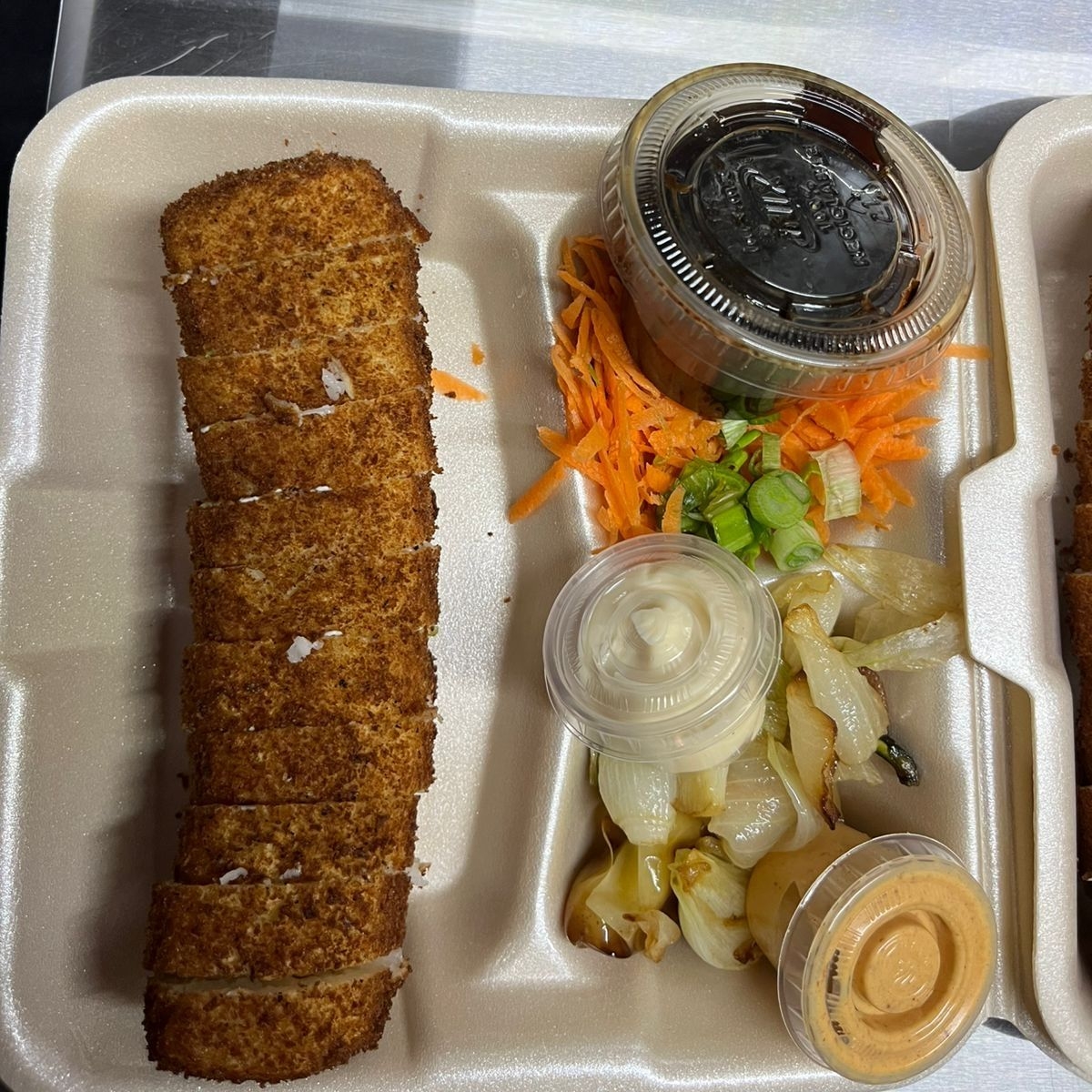 Empanizado. Por dentro: Philadelphia, aguacate, pollo y res. Horneado con topping especial de la casa (chipotle esp, Philadelphia, res, pollo, sriracha y serrano en rodajas).