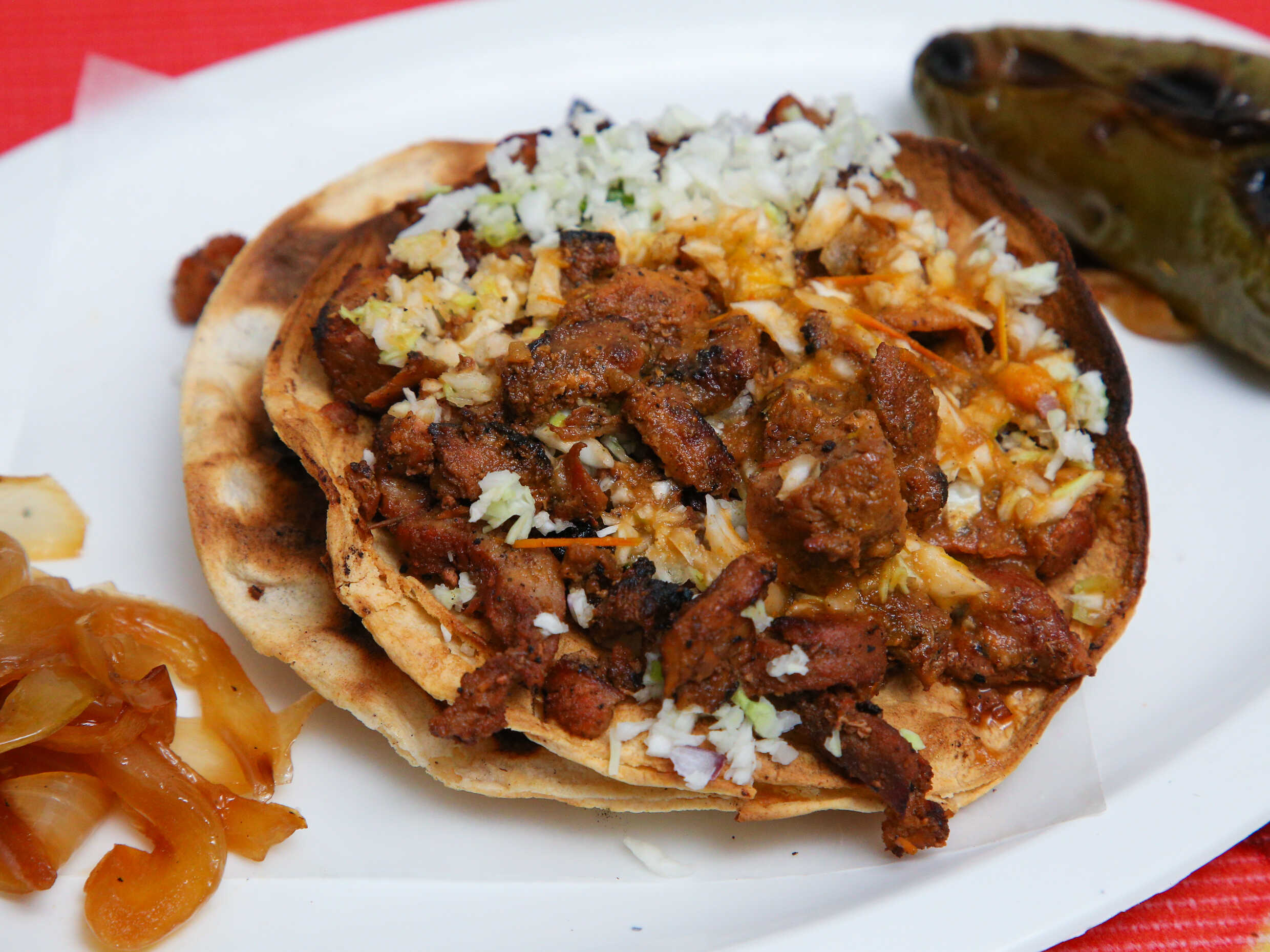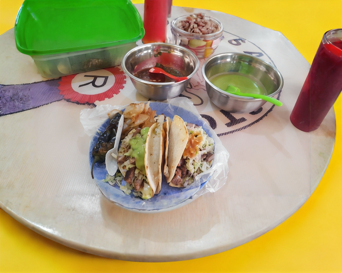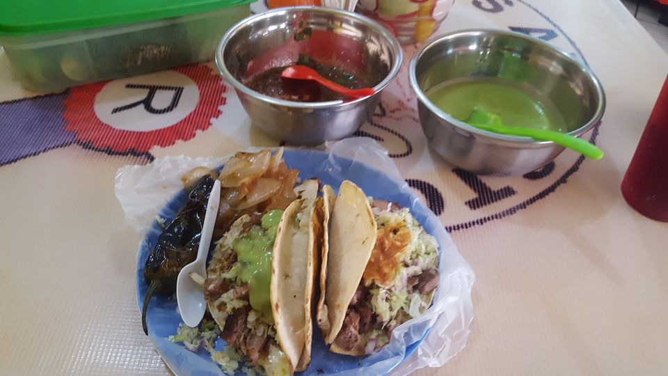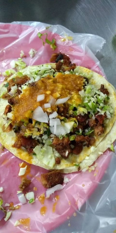 Tortilla doble calentada con manteca de puerco acompañado de carne adobada de la casa y su verdura la especialidad de la casa.