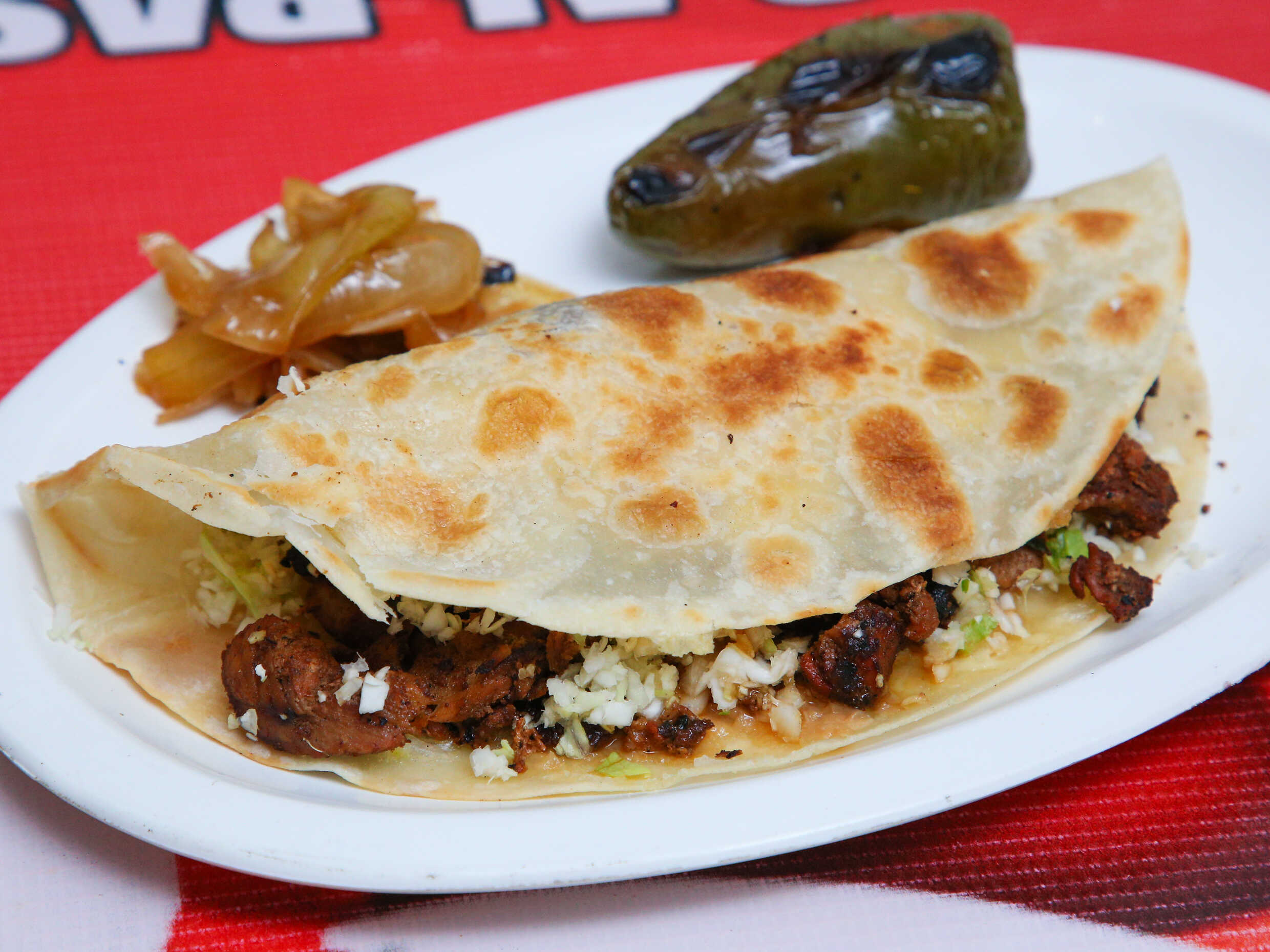 Taco doblado ( tortilla doblada dorada al carbón con carne).