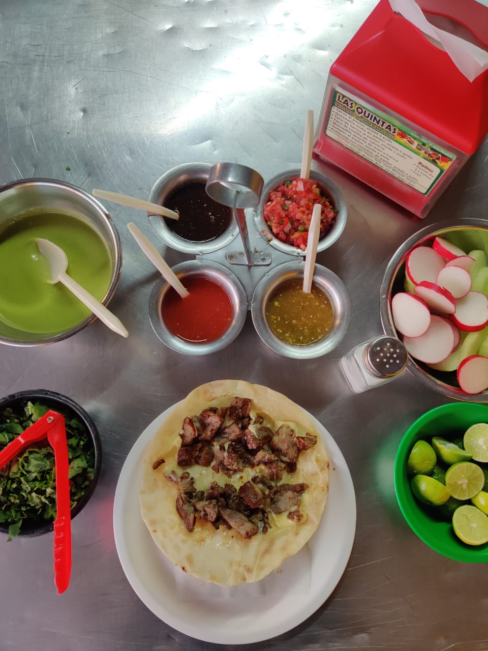 Tortilla de harina con queso, costilla de cabrería rebanada y repollo. Incluye: salsa tomate, salsa chile, salsa casera, guacamole, cilantro, pepino, limón.