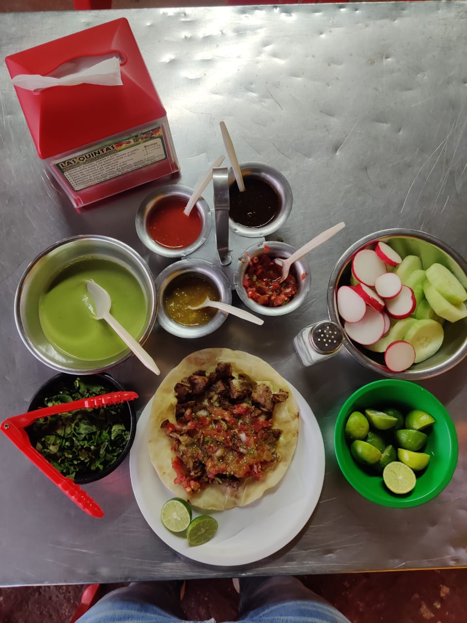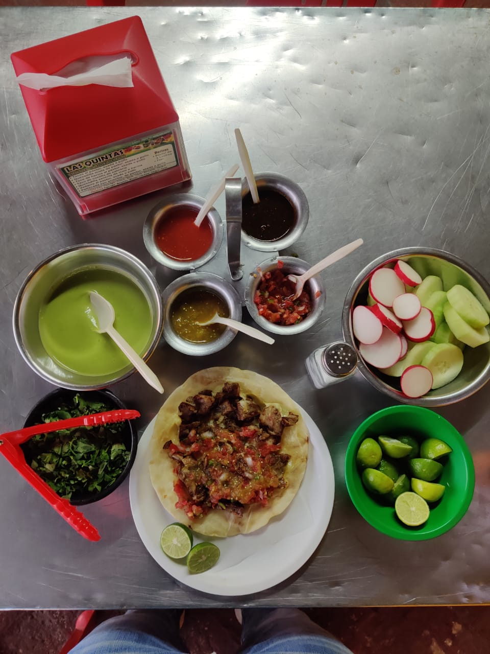 Tortilla de harina con costilla de cabrería y repollo. Incluye: salsa tomate, salsa chile, salsa casera, guacamole, cilantro, pepino, limón.