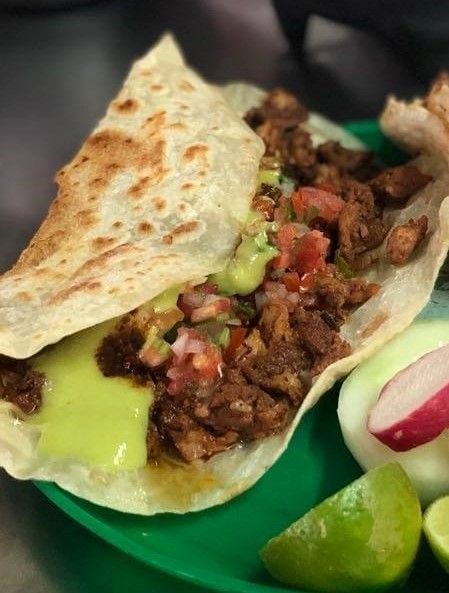 Tortilla de harina con queso, carne adobada y repollo. Incluye: salsa tomate, salsa chile, salsa casera, guacamole, cilantro, pepino, limón.