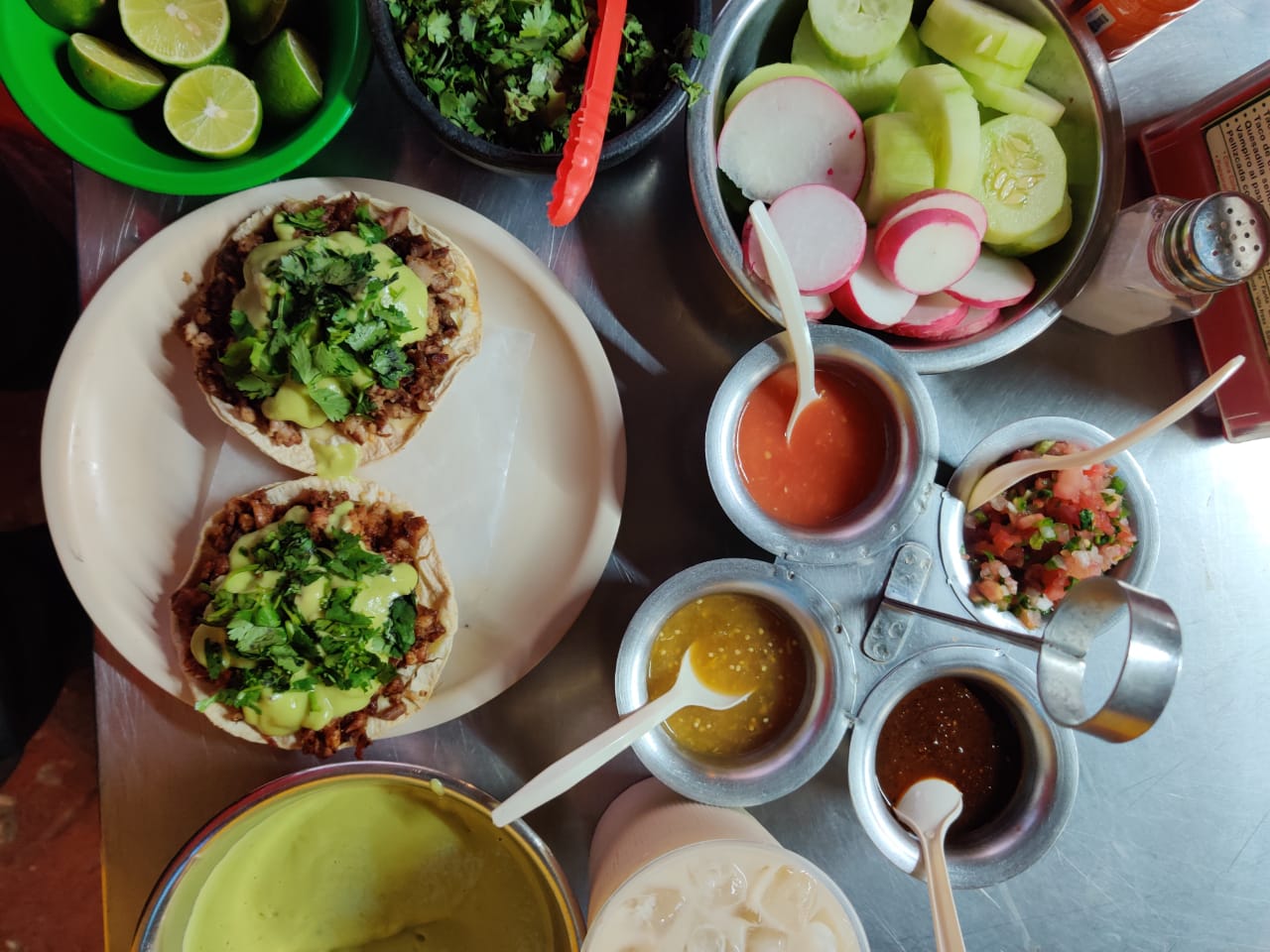 Tortilla de maíz con carne al pastor con repollo. Incluye: salsa tomate, salsa chile, salsa casera, guacamole, cilantro, pepino, limón.