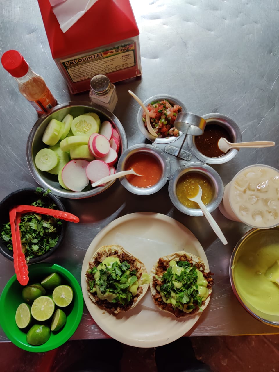 Sincronizada de maíz con carne de puerco asada y repollo. Incluye: salsa tomate, salsa chile, salsa casera, guacamole, cilantro, pepino, limón.