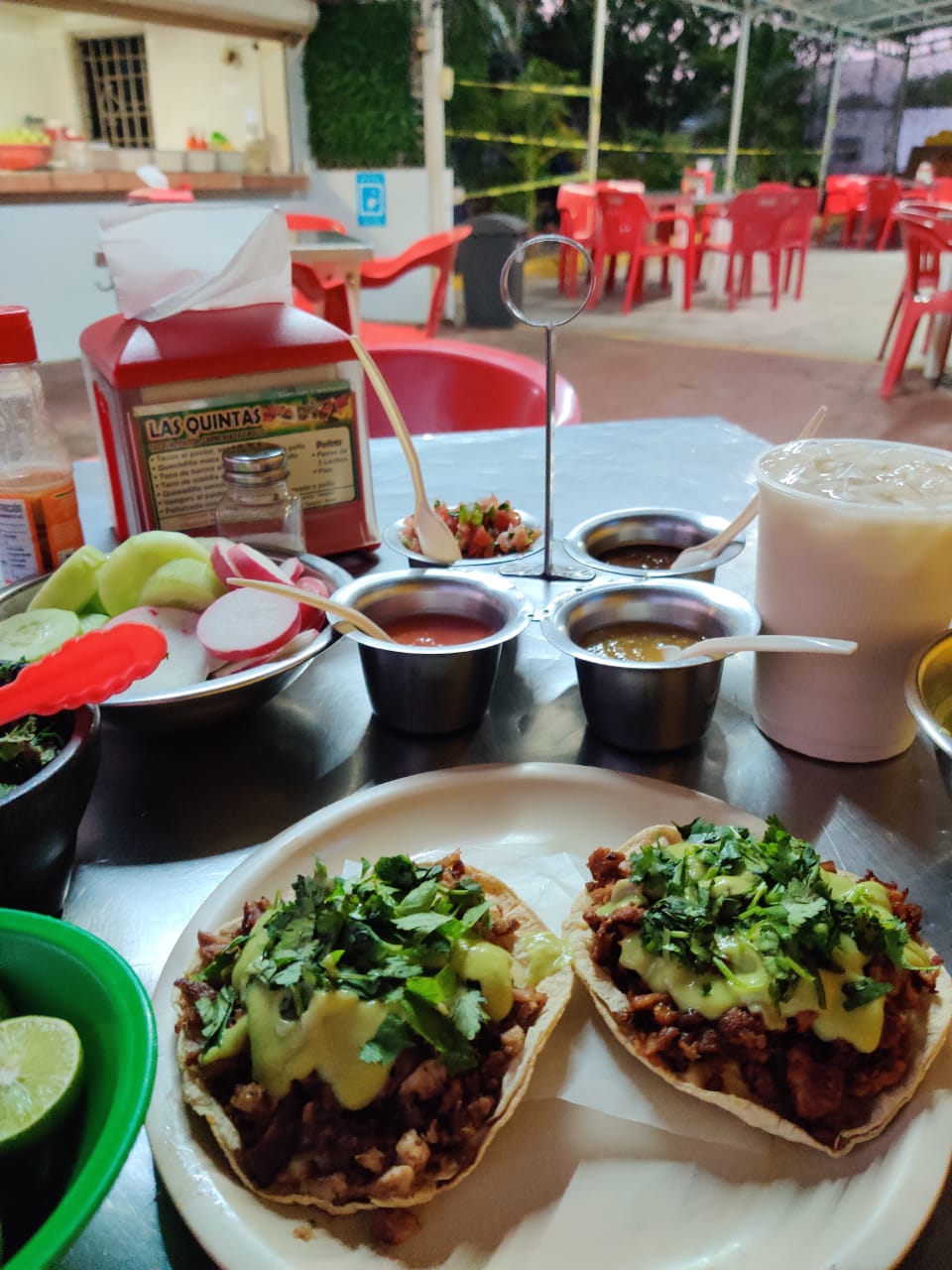 Tortilla de maíz con carne de puerco asada y repollo. Incluye: salsa tomate, salsa chile, salsa casera, guacamole, cilantro, pepino, limón.