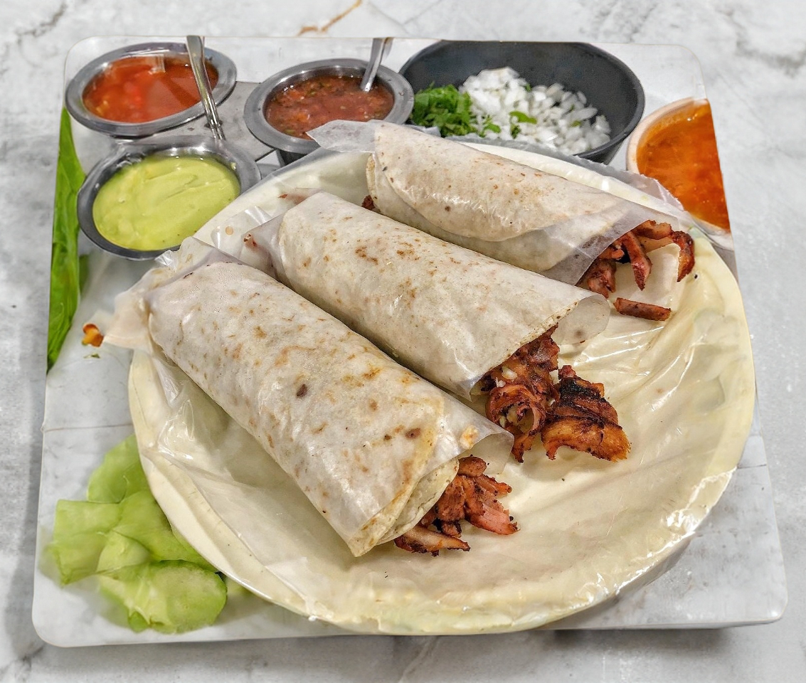Deliciosa quesadilla de harina de carne al pastor, acompañado de cebolla blanca, cilantro y cebolla asada.