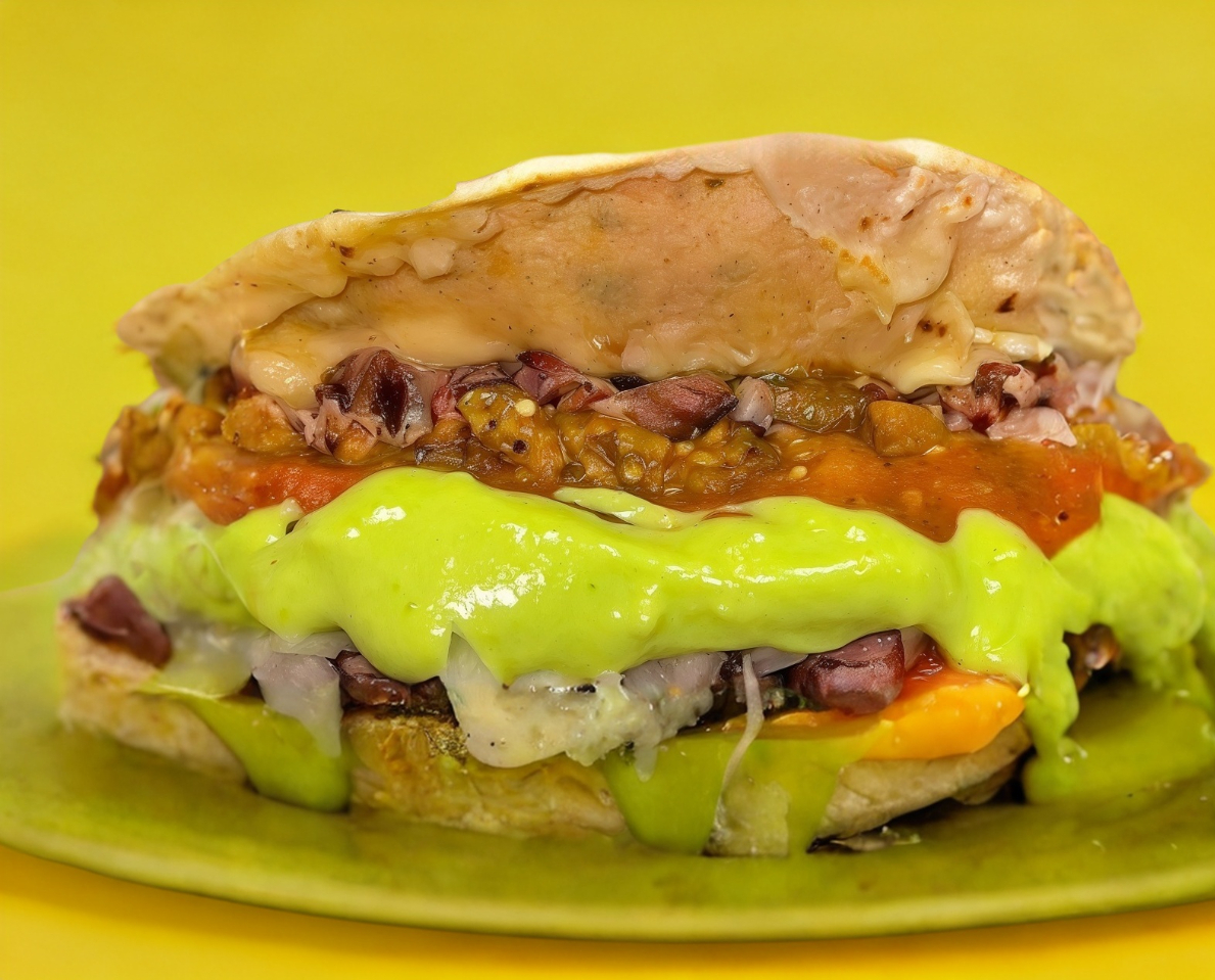 Taco de harina de más de 20 cm. relleno con la proteína que elijas, frijol untado, cebolla, jugo de tomate y picante