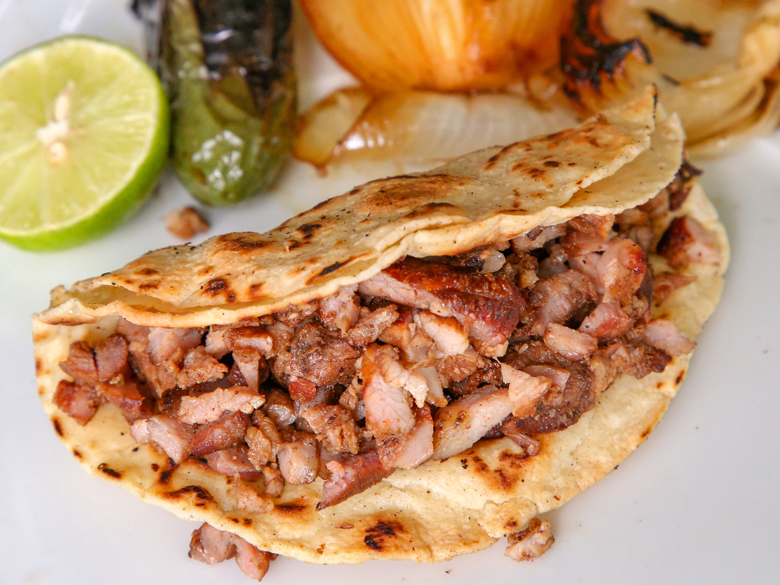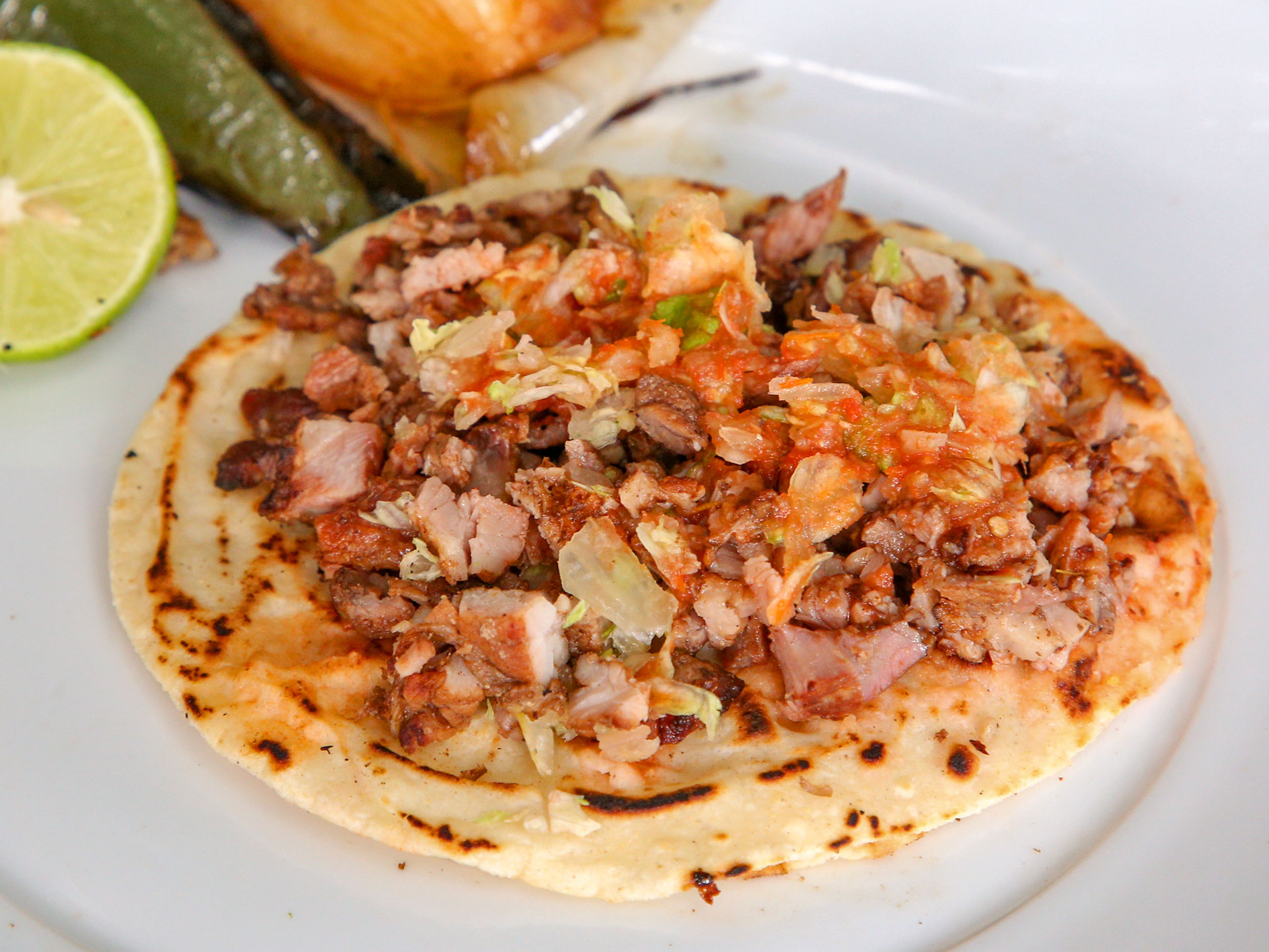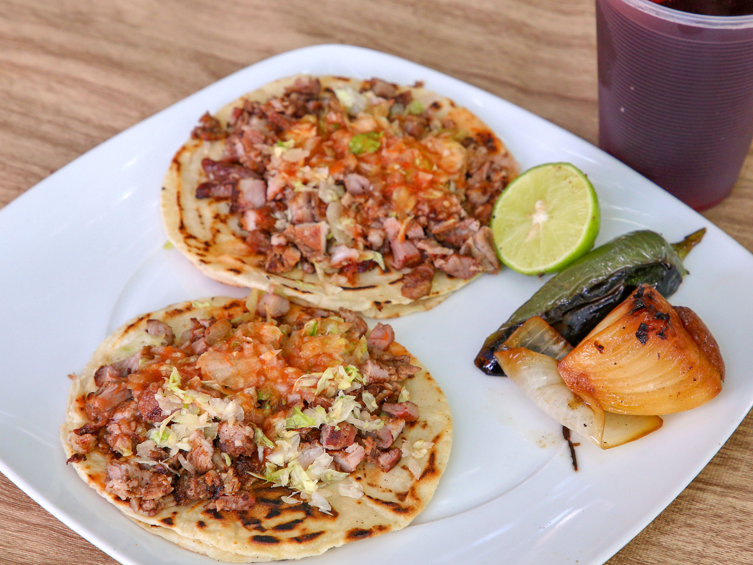 Taco con tortilla doble (grande), carne asada, queso chihuahua, lechuga, jugo de tomate y complementos (guacamole, cebollita asada, chile toreado y 2 tipos de salsa).
