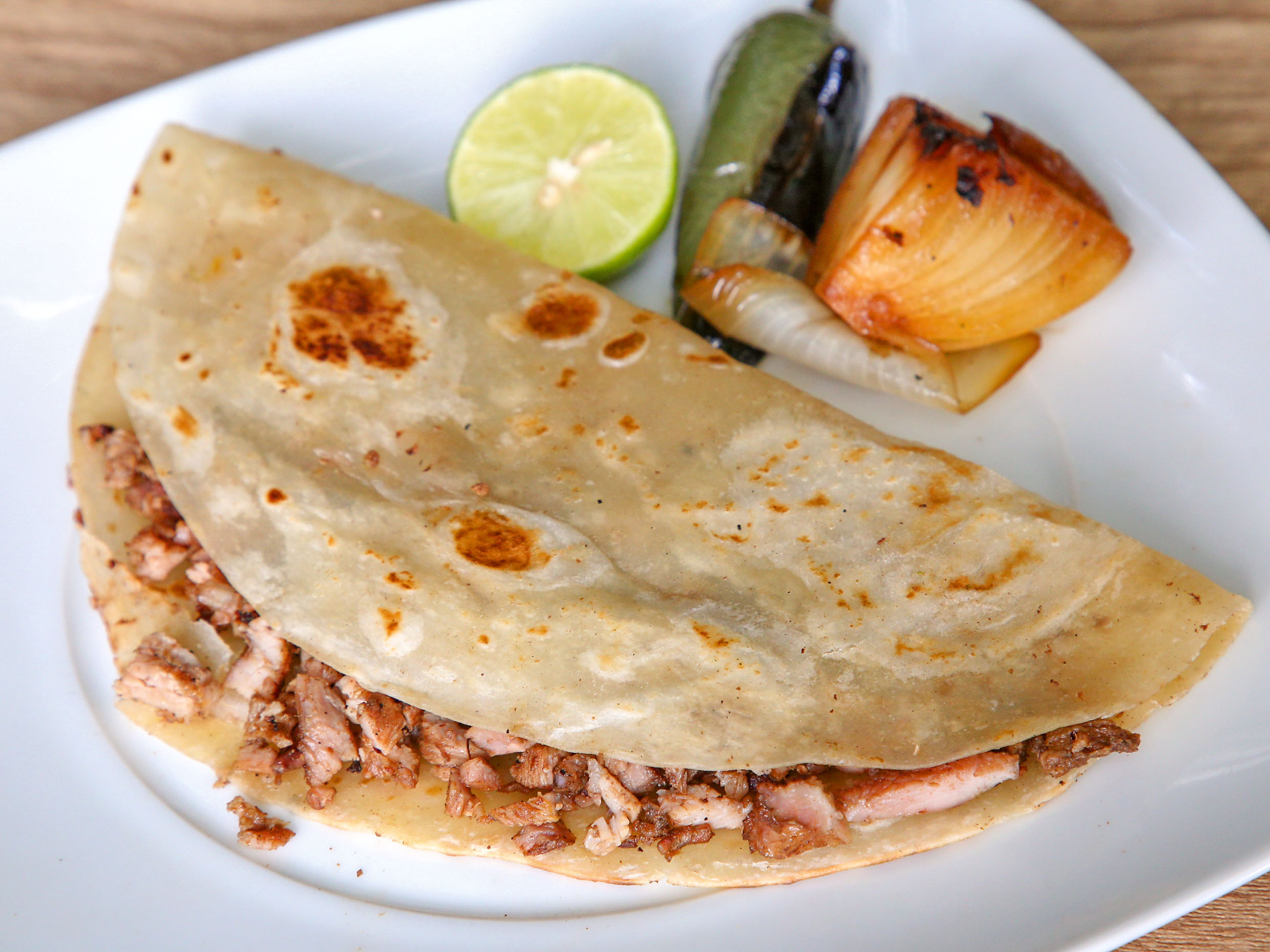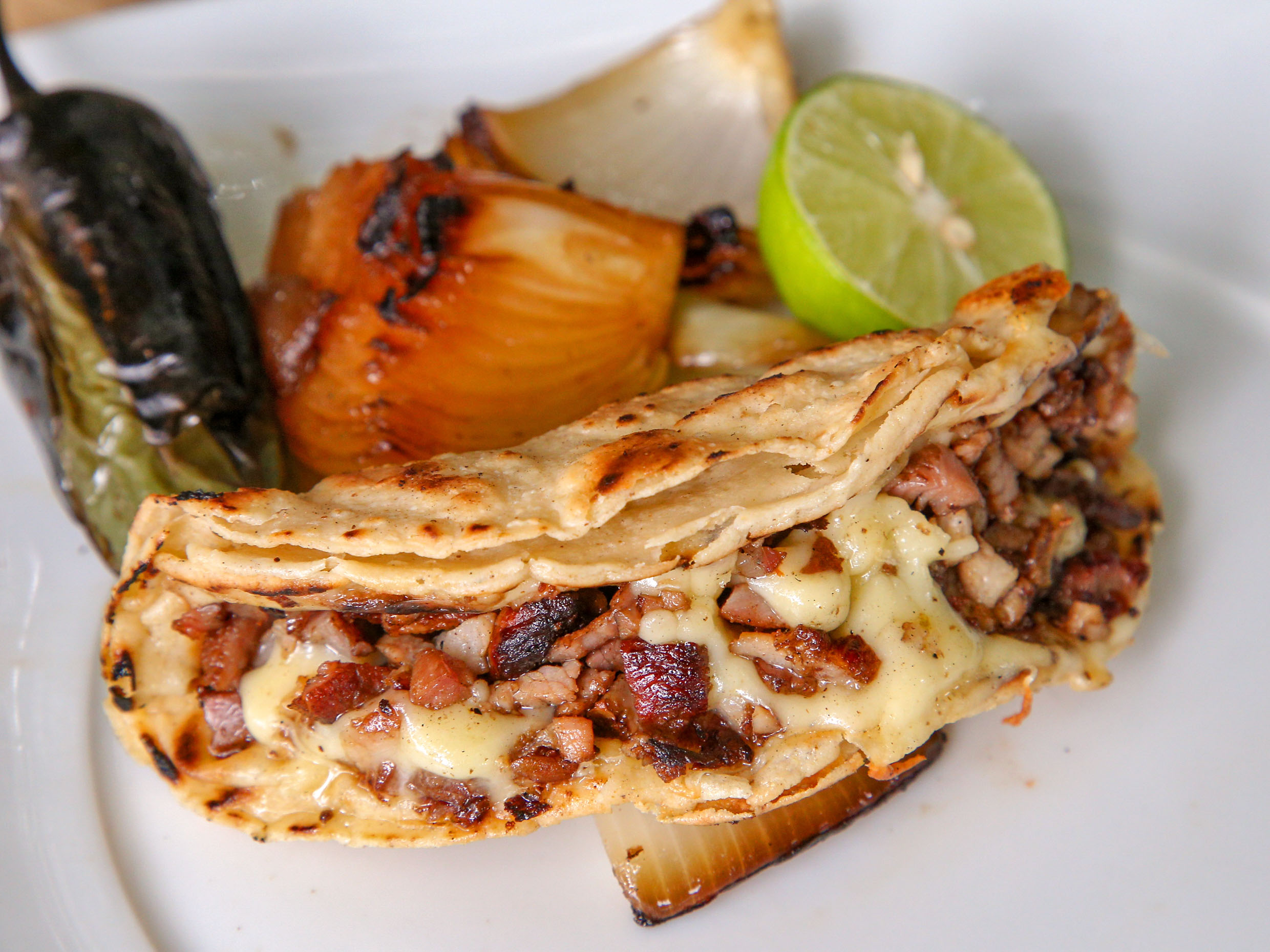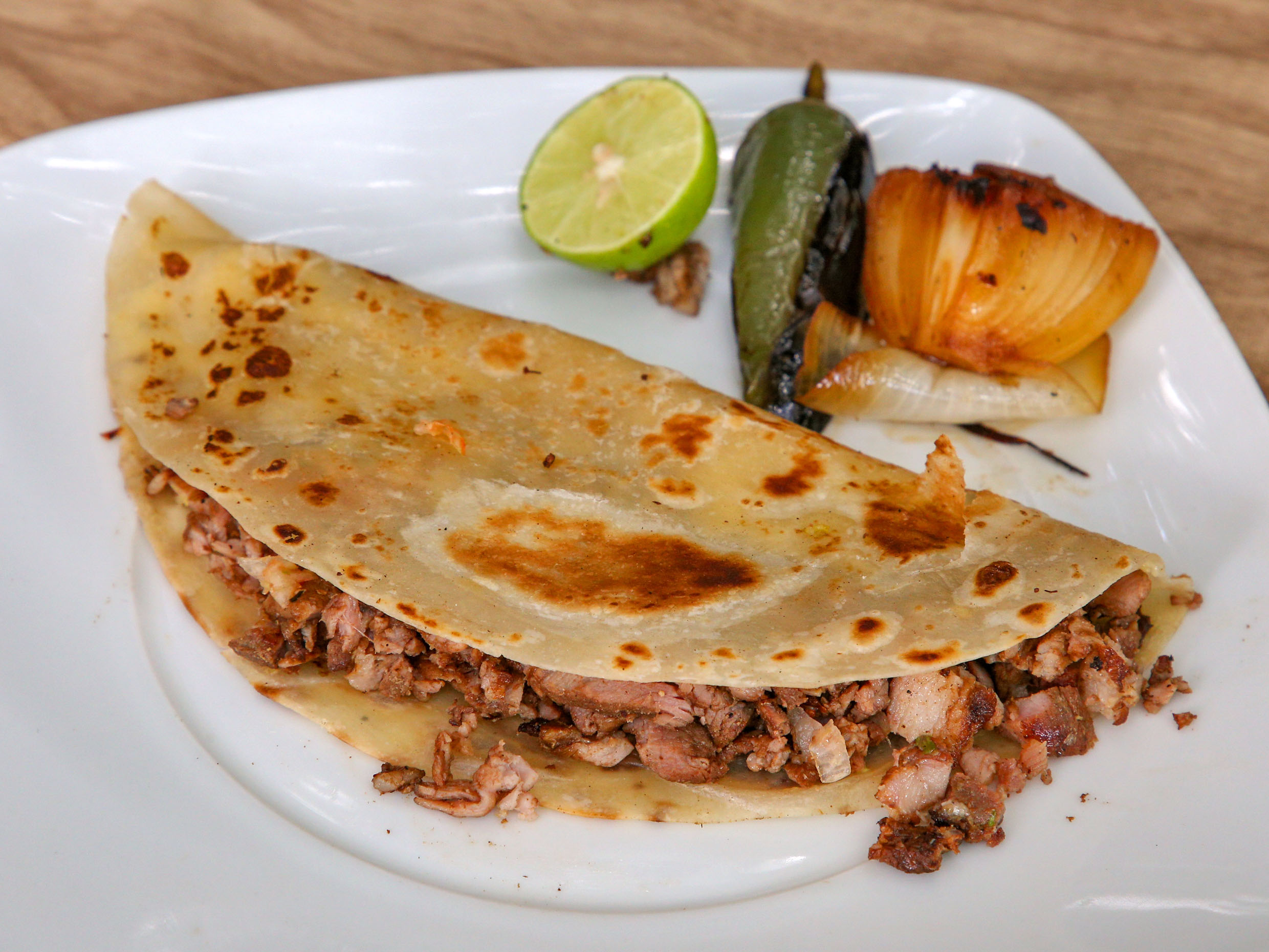 Tortilla de harina (grande), queso chihuahua, carne asada, lechuga, jugo de tomate y complementos (guacamole, cebollita asada, chile toreado y 2 tipos de salsa)