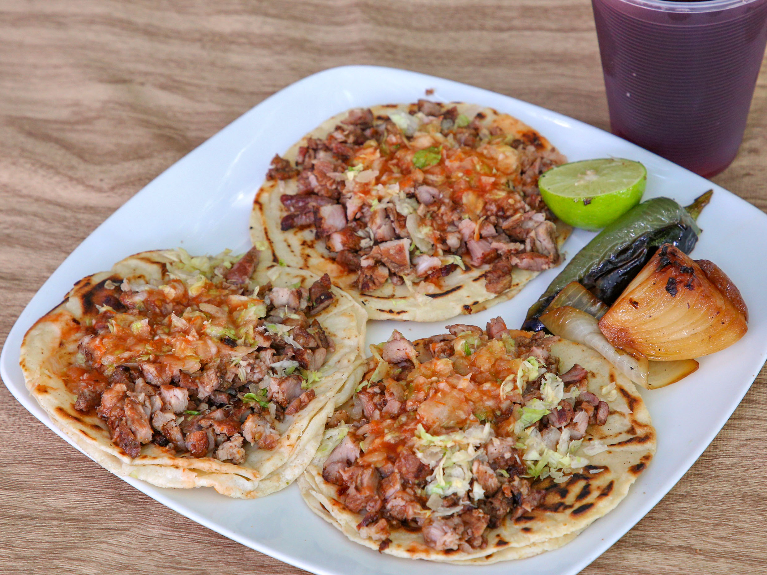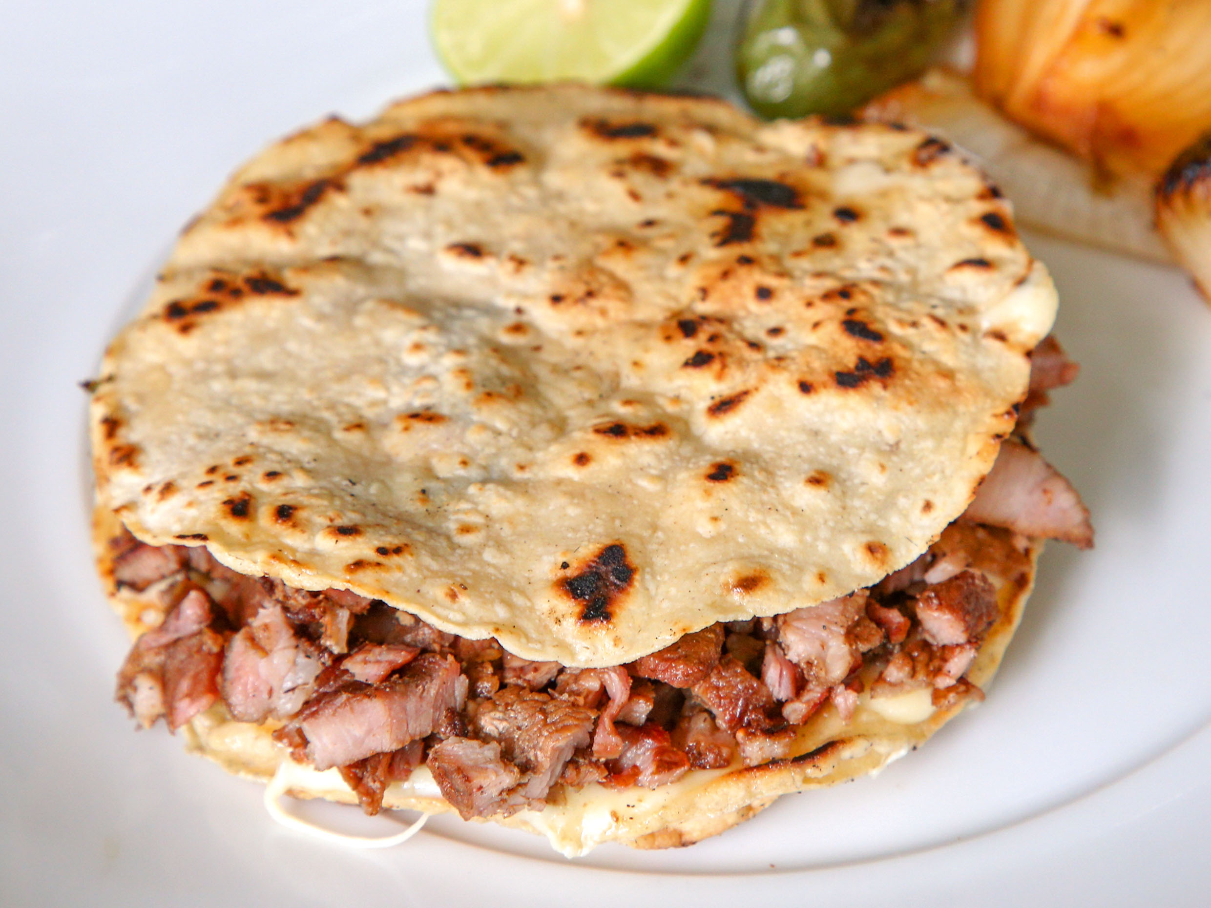 Tortilla dobre dorada de base con tortilla de tapadera dorada, queso chihuahua carne asada, lechuga, jugo de tomate y complementos (guacamole, cebollita asada, chile toreado y 2 tipos de salsa)