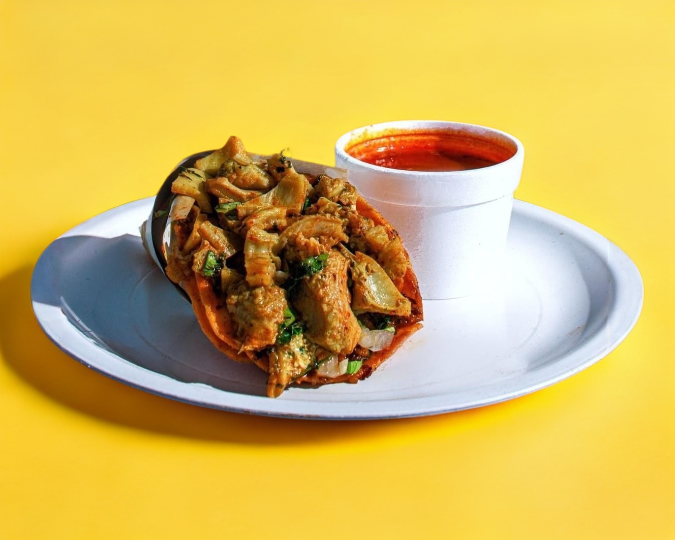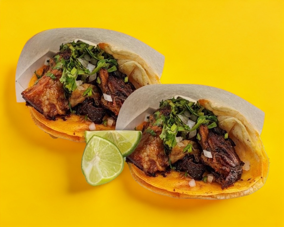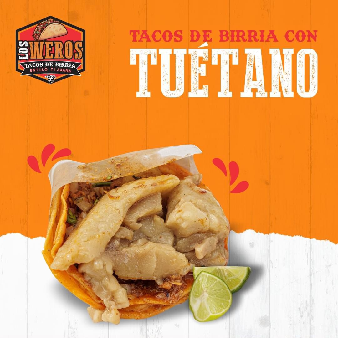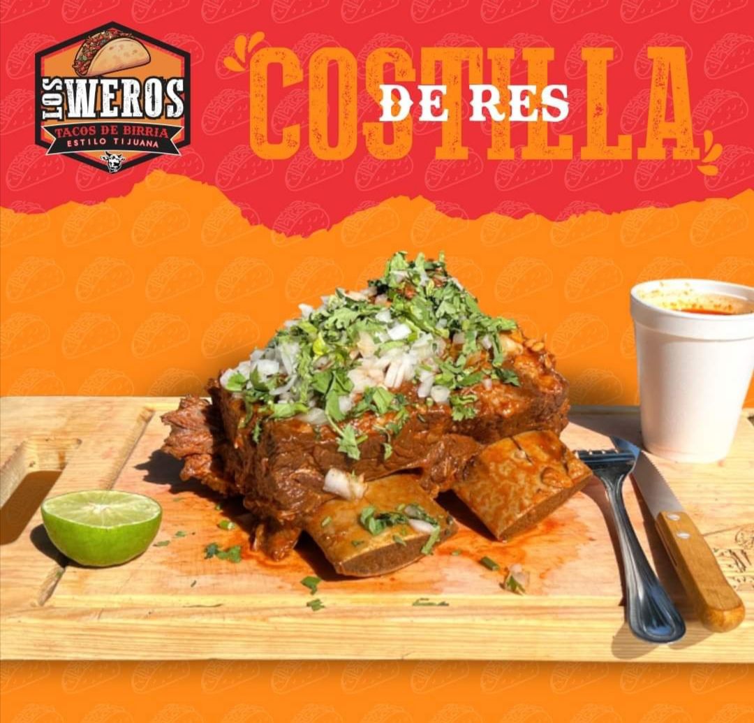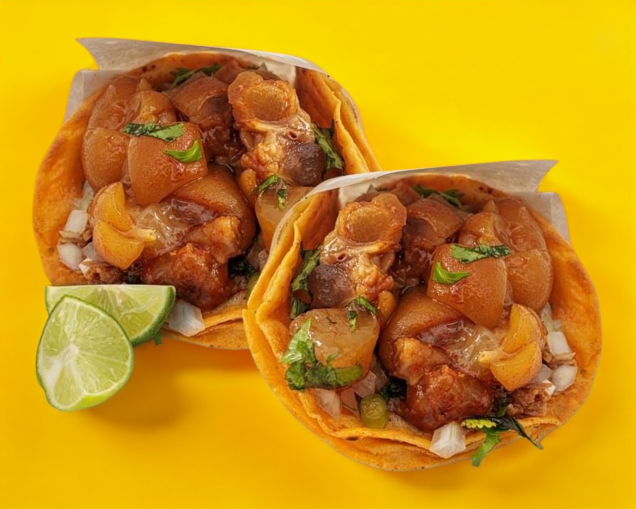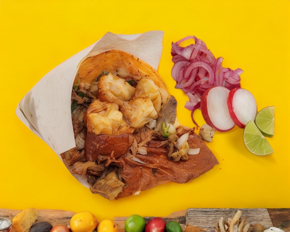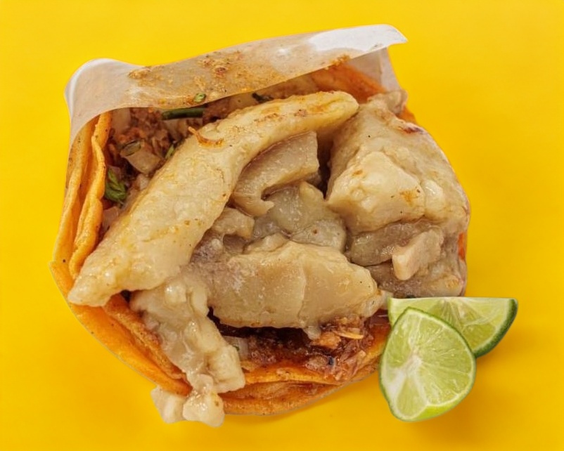 Tortilla de maíz semi dorado, base de birria con topping de tripa, panza, menudo, costila, tuètano y nervio.