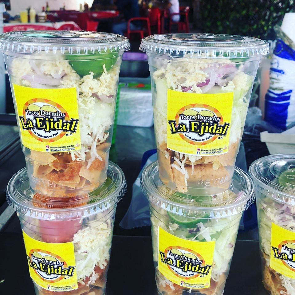 3 Unidades de tacos dorados de papa con verdura, un kit de crema, queso y salsa. Platillo personal.