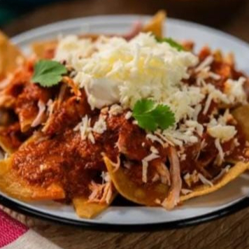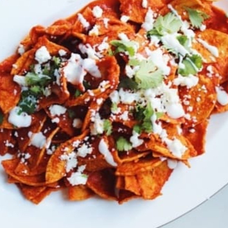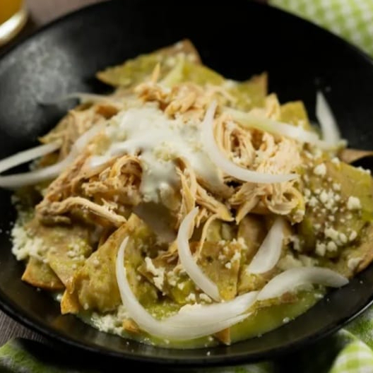 Tortillas crujiente salsa picante pollo quesó crema cilantro cebolla