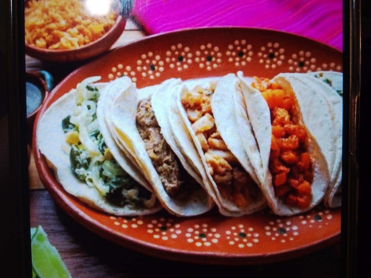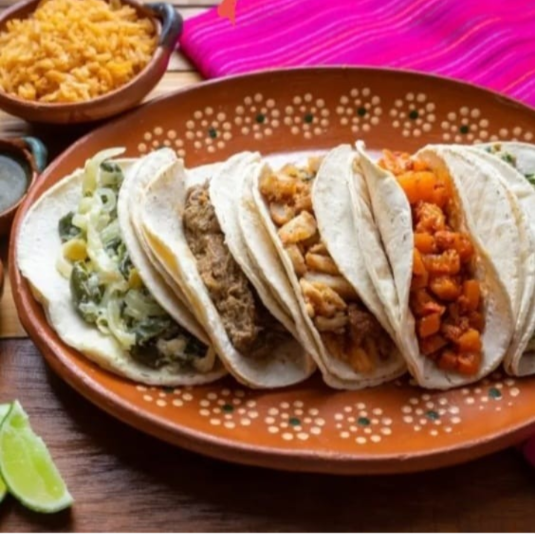 Tortillas de nixtamal chicharrón salsa Roja lechuga cebolla curtida