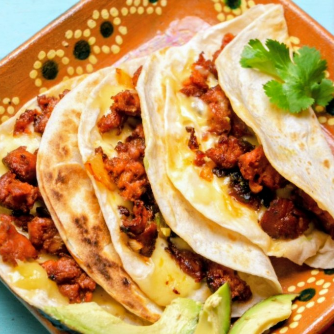 Tortilla de Arina con guiso de chicharrón en salsa verde lechuga cebolla curtida