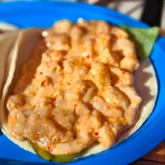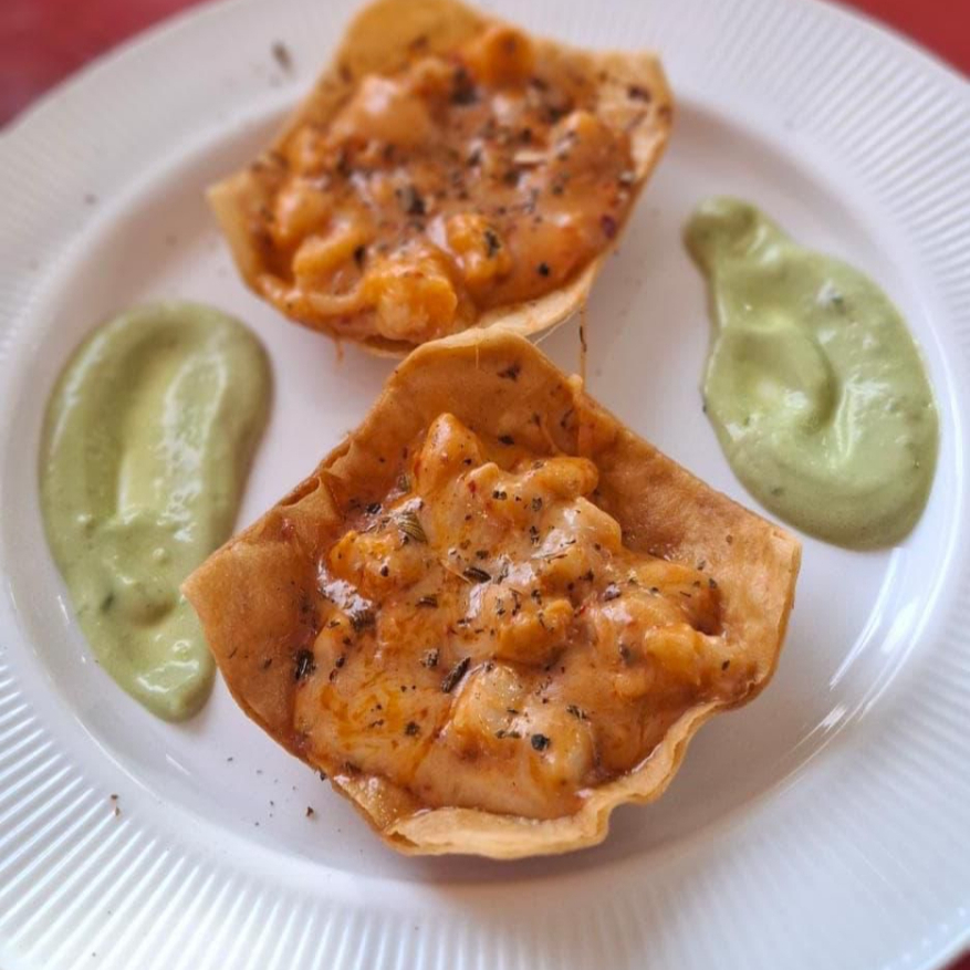 TOSTADA DE MAIZ FRITA RELLENA DE CAMARÓN PICADO CON SALSA SECRETA Y GRATINADO