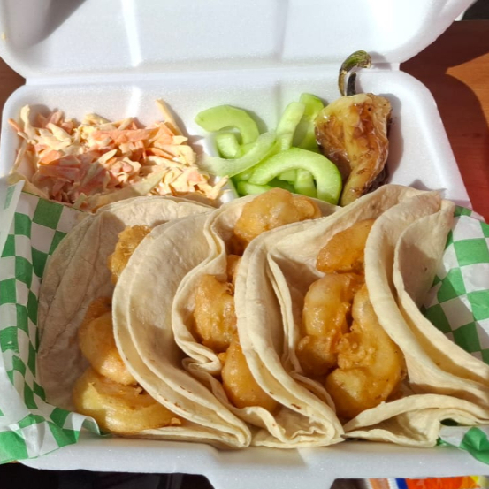 DOBLE TORTILLA DE MAIZ CON CAMARON CAPEADO, ACOMPAÑADO DE ENSALADA DE REPOLLO CON ZANAHORIA, CHILE CARIBE, PEPINO Y LIMON
