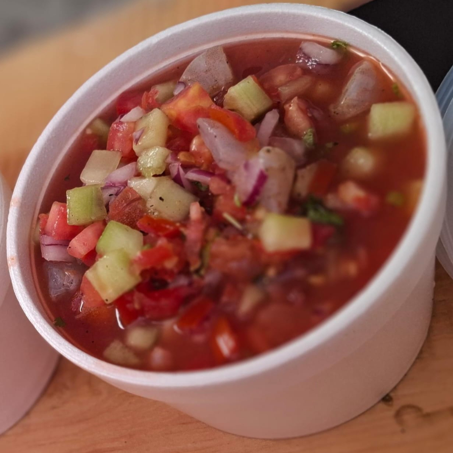 CAMARÓN COCIDO PICADO, TOMATE, CEBOLLA, PEPINO, LIMON Y CLAMATO