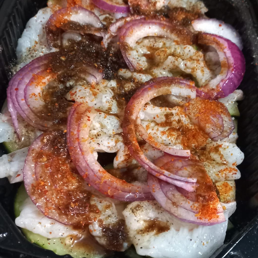MARLIN GUISADO CON TOMATE, CEBOLLA, CHILE POBLANO, ACOMPAÑADO DE CEBOLLA MORADA, LECHUGA, LIMON