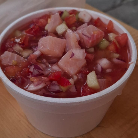 PESCADO PICADO , TOMATE , CEBOLLA, PEPINO , LIMÓN Y CLAMATO