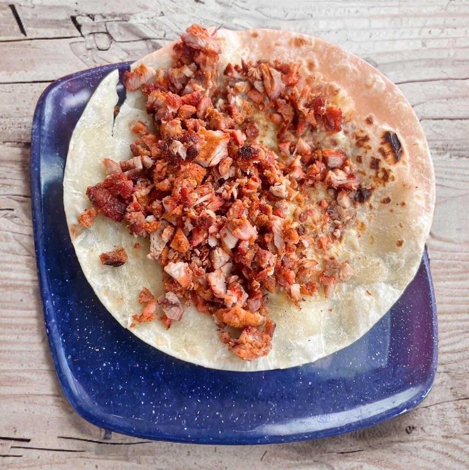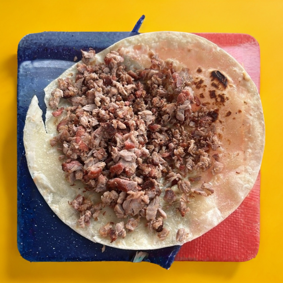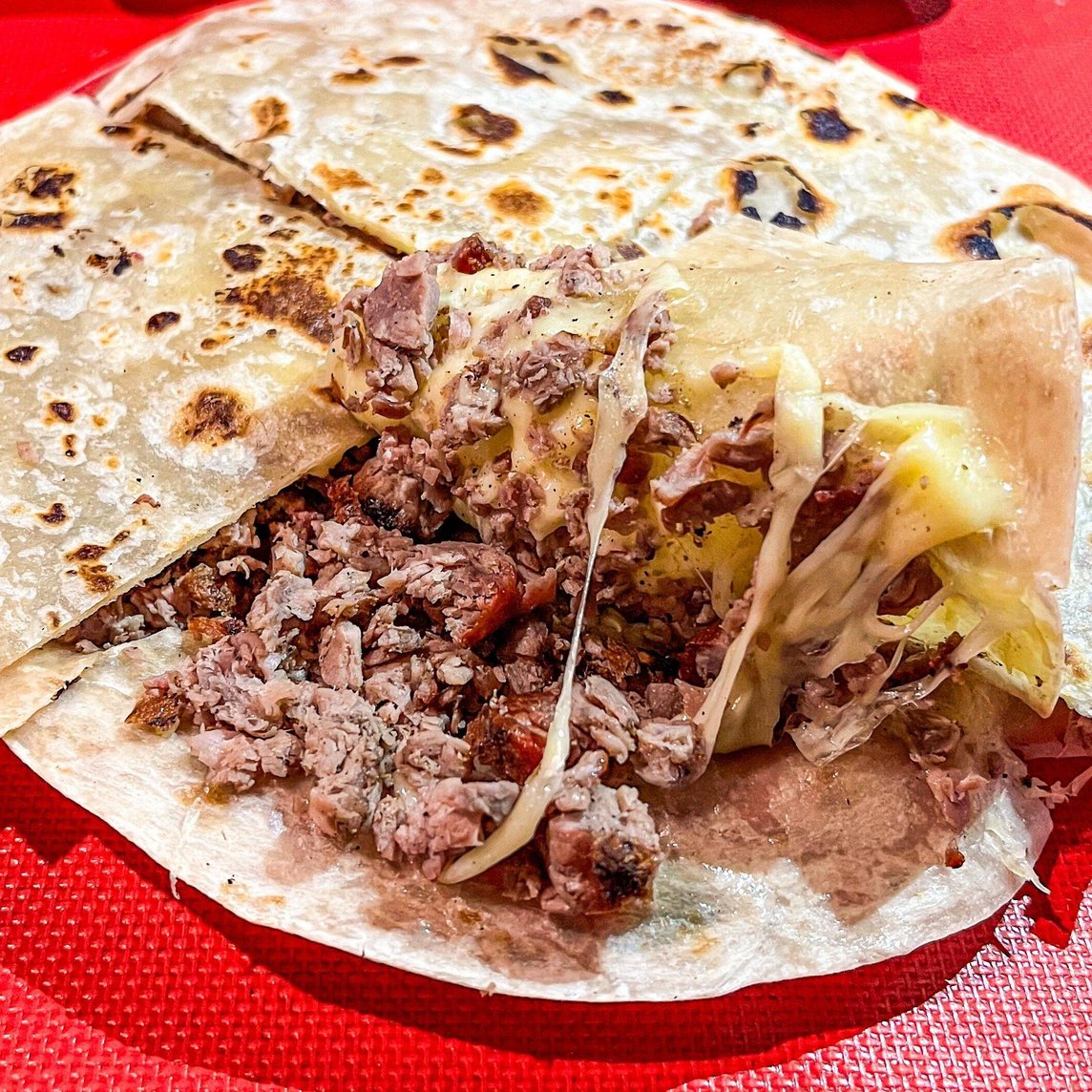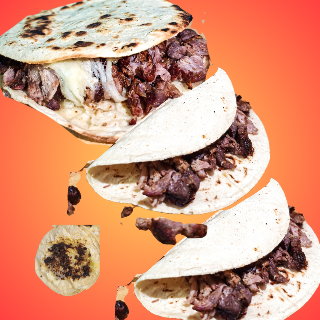 Tortilla hecha a mano para pellizcada con asiento de puerco y queso chéster con carne asada.