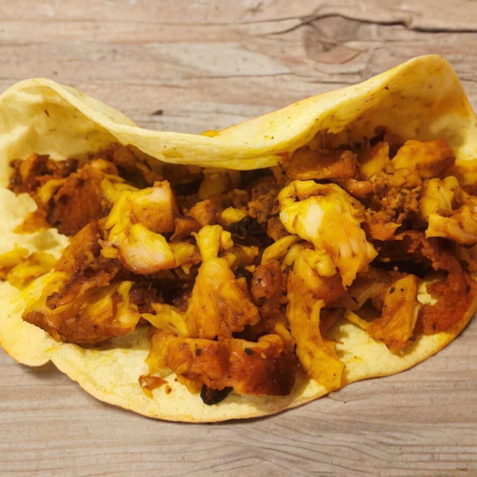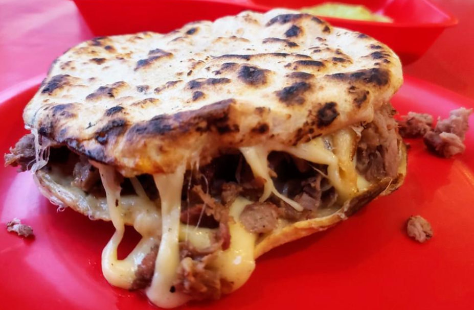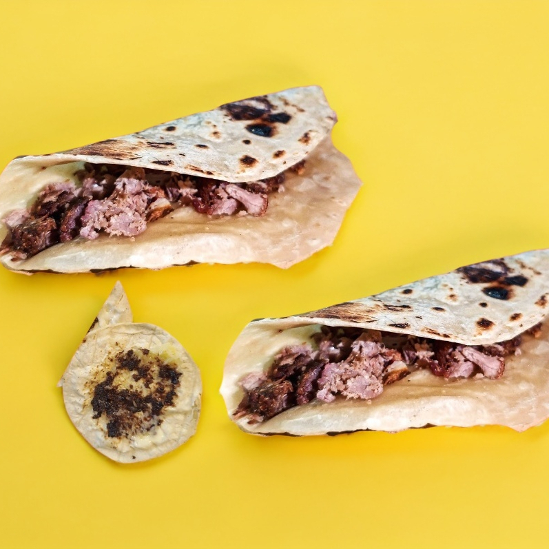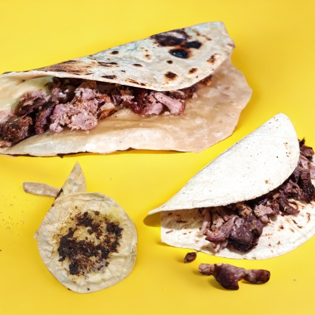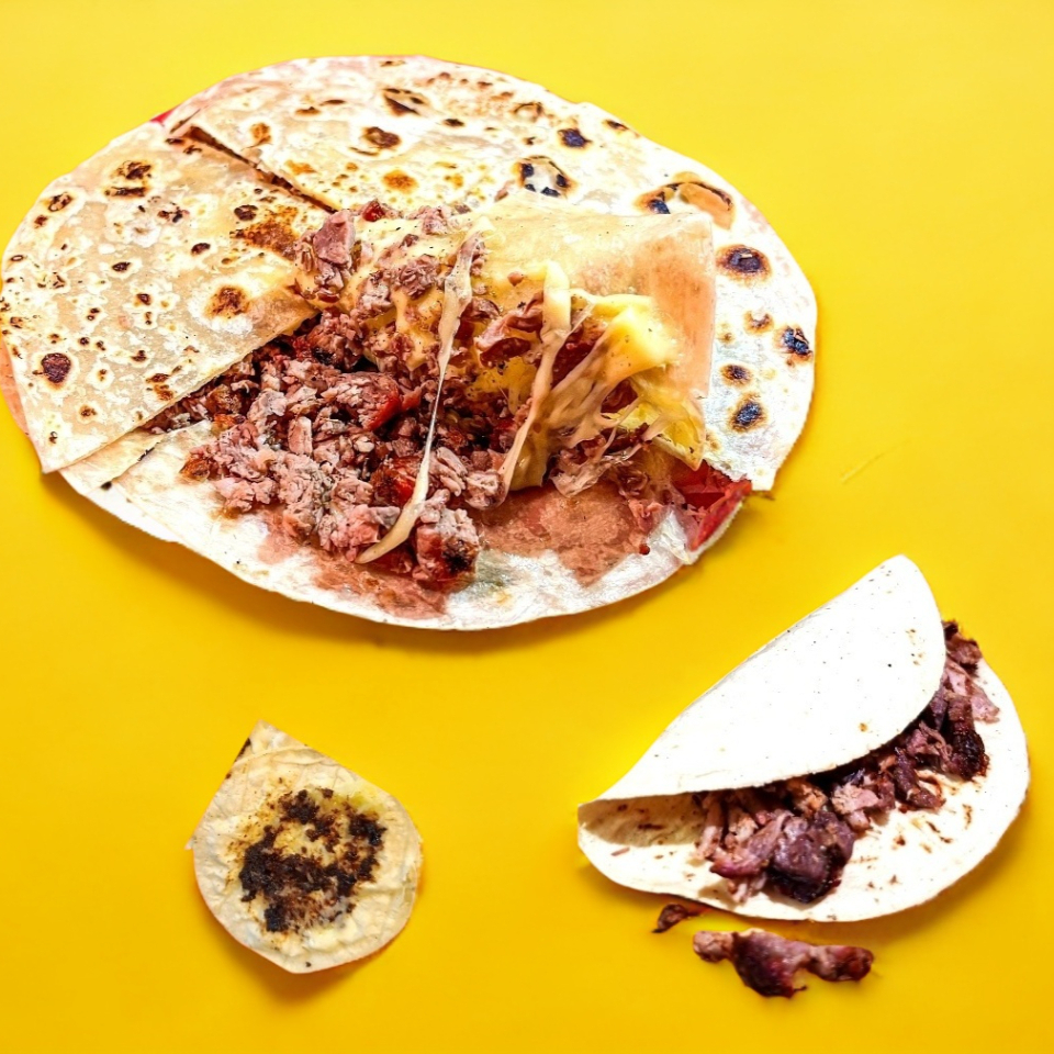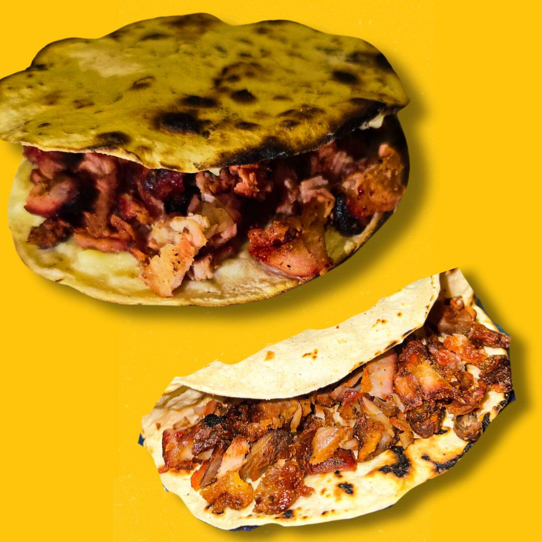 Tortilla hecha a mano para pellizcada con asiento de puerco y queso chéster con carne asada.