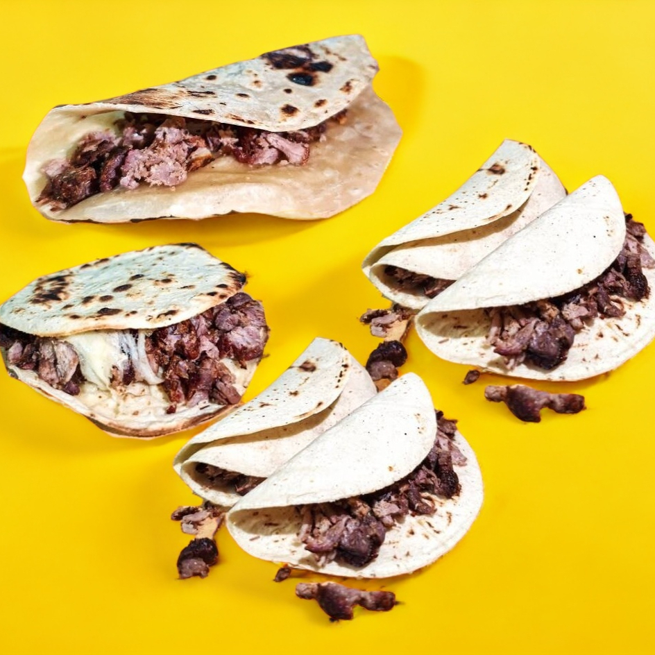 Tortilla de harina chica con queso gouda + 50 gr aprox de carne asada. (Tamaño personal)