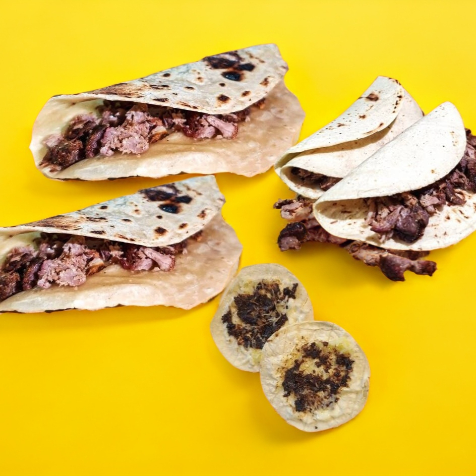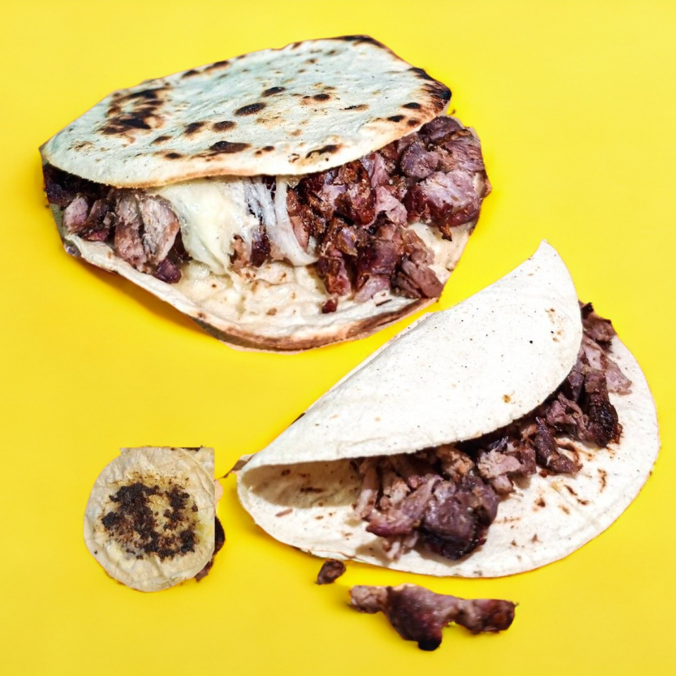 Dos tortillas doradas al carbón con queso adentro y carne asada 50 gr aprox c/u. (Tamaño personal)