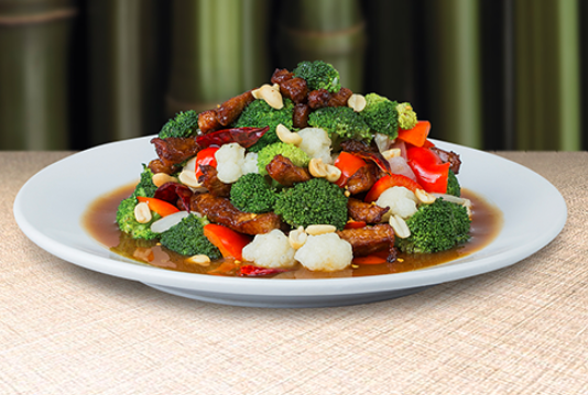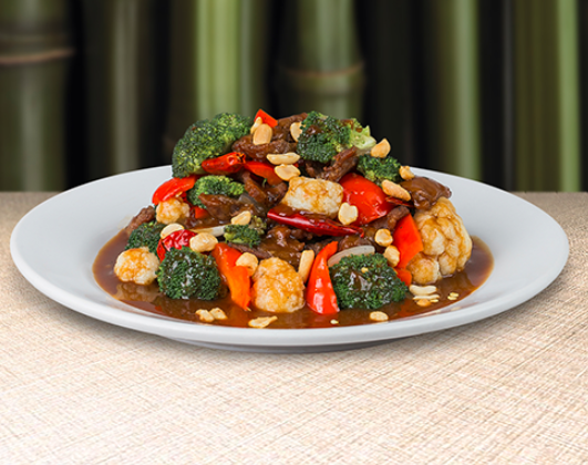 Sabor picosito combinado con brócoli, pimientos y cacahuate, sobre una base de arroz blanco.