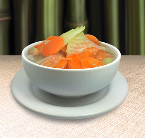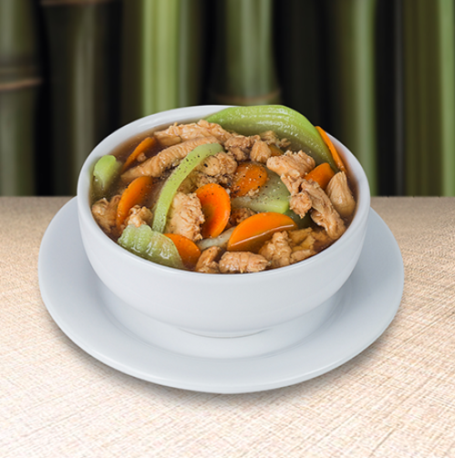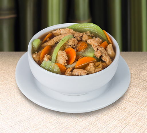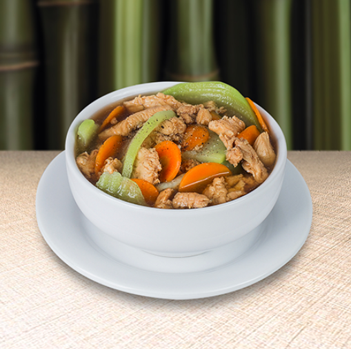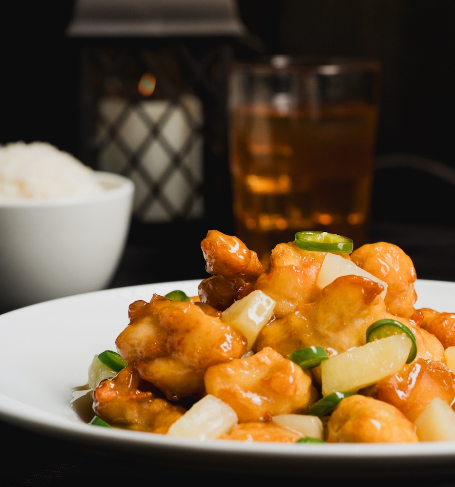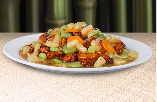 Dulce sabor de pollo con trocitos de piña, zanahoria, cebolla, chayote y apio, sobre una base de arroz blanco.