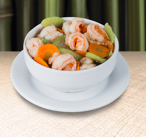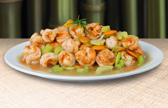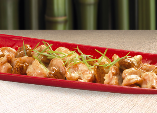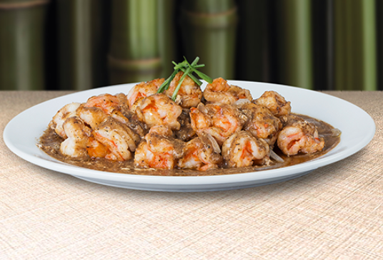 Suaves camarones bañados en nuestra deliciosa salsa dulce y nuez garapiñada.