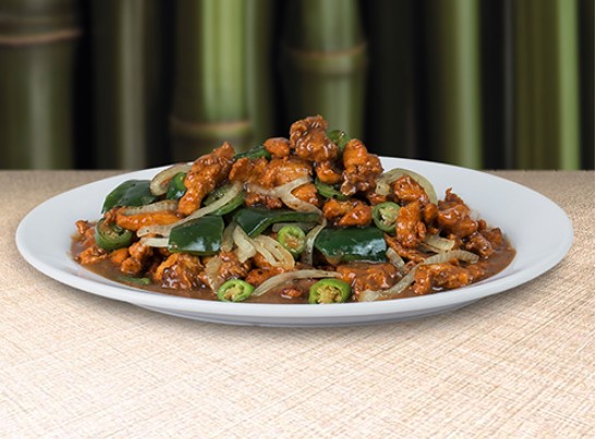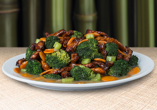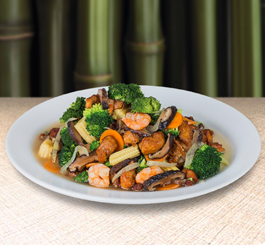 Pollo (individual 60 g o para compartir 120 g), cerdo (individual 55 g o para compartir 110 g) y camarón (individual 25 g o para compartir 50 g), combinado con brócoli, hongo negro y elotitos chinos.