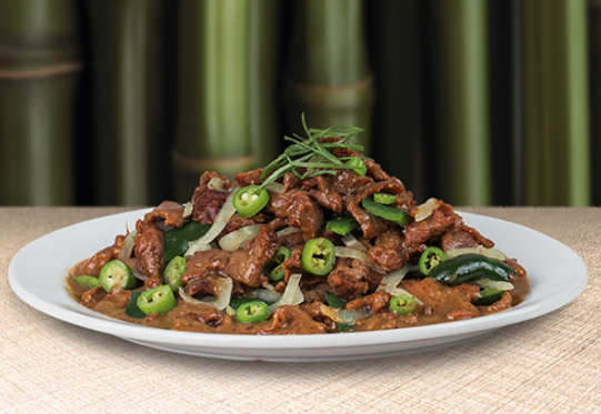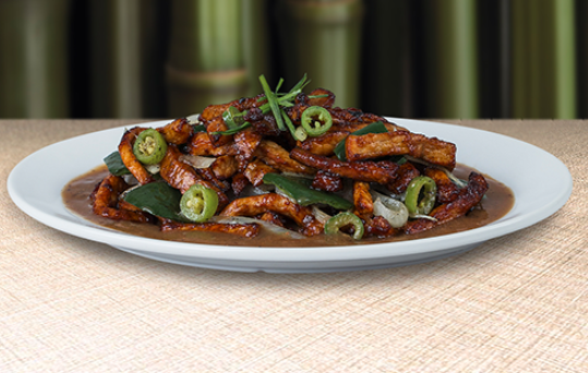 Deliciosas tiritas de carne de cerdo marinado con ejotes frescos, realzado con el toque especial del cacahuate.
