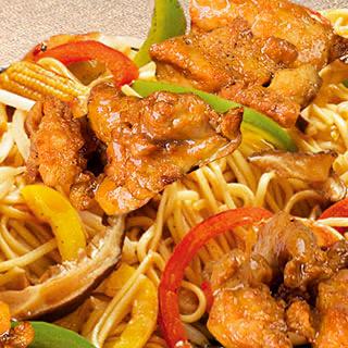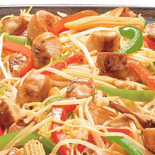 Tallarines de arroz salteados en wok con un toque de jenjibre, pollo y pimientos frescos, en una deliciosa salsa.