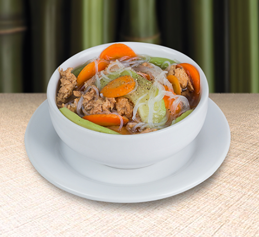 Servida con carne de cerdo (40 g), pollo (40 g), camarón (50 g), verduras y fideos de noodles.